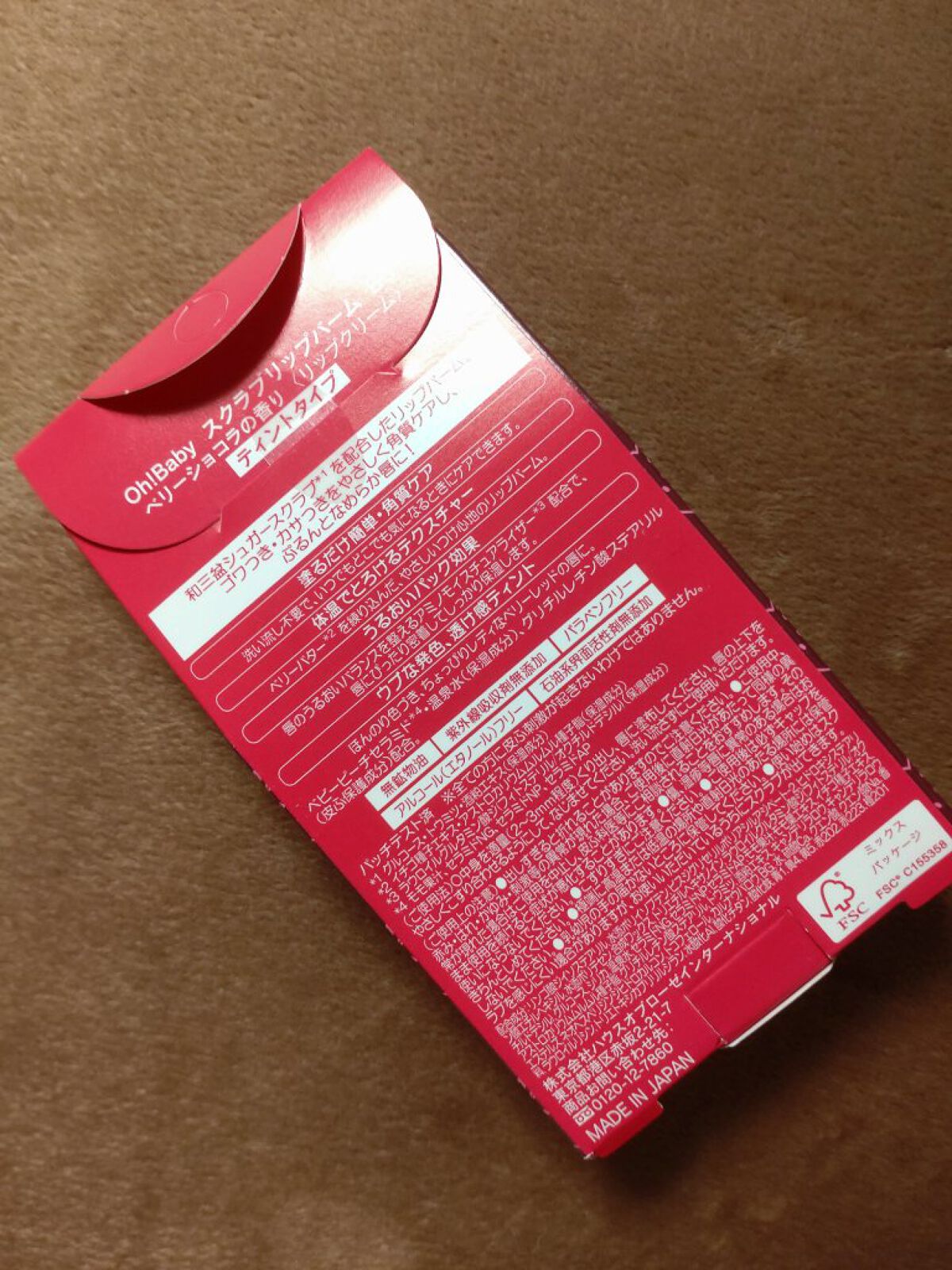 ❤️Oh!Babyスクラブリップバームベリーショコラ❤️角質ケアができるシュガースクラブ入りのリップバームです💄💕スクラブ入りなのでザラザラ感は感じますが塗り心地は良いかと思います😊バームですが発色はよく、保湿力も高いです🙆🏻♀️リップクリ...