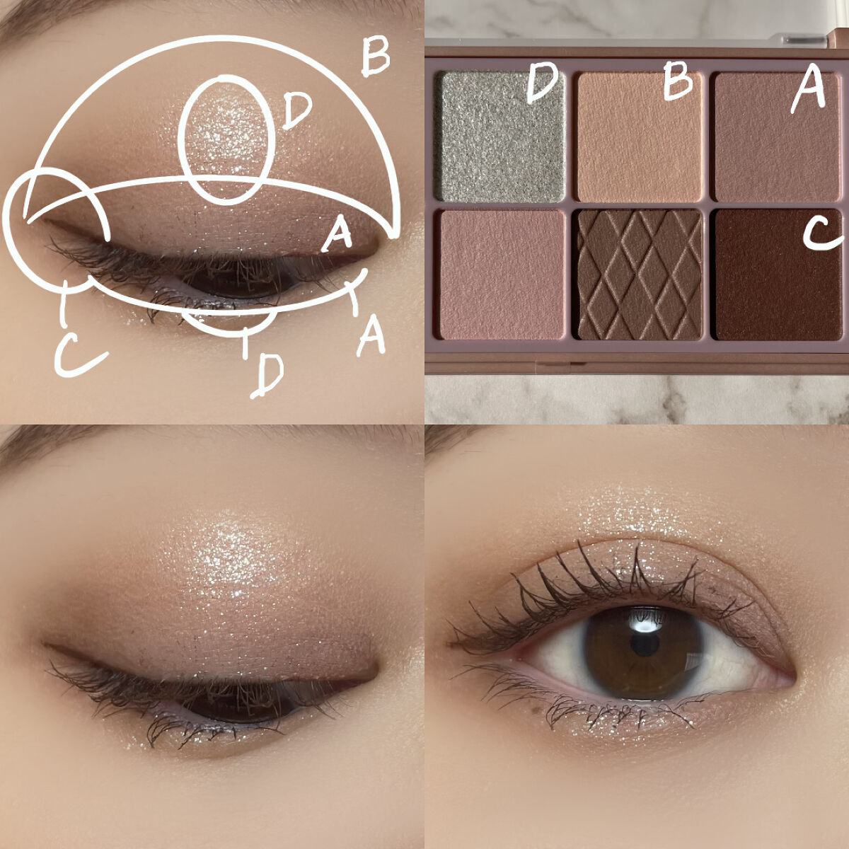 まず色の透明感に驚く! 右上のベージュは、まぶたに馴染むのに綺麗に明るく魅せるカラーでベース仕込みにぴったり✨ 左のラメ2色は言葉はいらないよね。 誰が見ても可愛いと言うだろう、ダイヤモンド並みの輝きを放つラメ✨✨ 右下のブラウンは これもかなり透明感のあるカラー! しっかりめに塗っても濃くなりすぎないカラーで 締め色が苦手な人も塗ってみて🥹 思ってた以上に可愛いアイパレで 大大大満足!!!