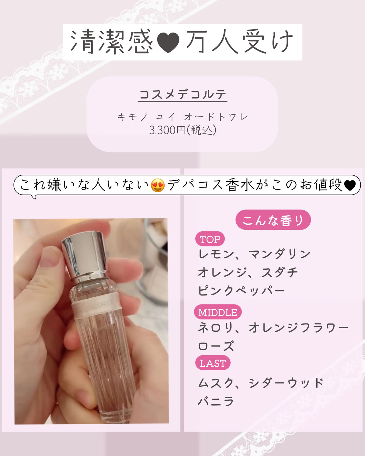 | 香水ランキング第50位 | プチプラでコスパ高いし、万人受けしそうないい香りがします🤍 | 詳細を見る | |