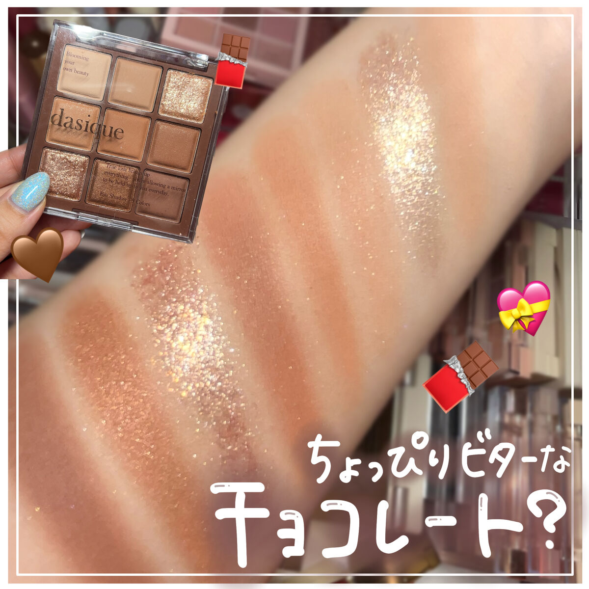 奥ゆかしいチョコレートブラウンムードを詰め込んだアイシャドウパレット🧸 色味はもちろん、アイシャドウが立体的になっていて、本物のチョコレートみたいな、見た目からして可愛い❣️ マットからラメ、グリッターまでバリエーション豊富な9色で、思いのままにアイメイクができる万能パレット🐰
