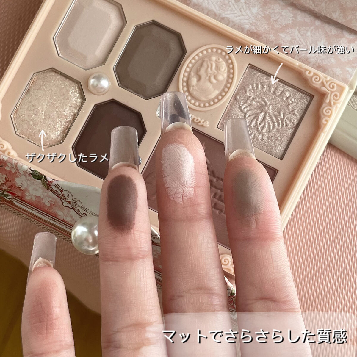 全6色❕ イエベ向きのくすみカラーです✊🏻 ̖́- ハイライトとして使える細かいパールと涙袋としても大活躍間違いなしのラメ❕ マットでサラサラ 触ってて気持ちいい🤪 筆だと肌に色が乗りづらいかもです😖🌀 特にラメは指でやらないと粉飛びしちゃいました 持ってていて損はないパレットだと思います⋆⸜🌷⸝⋆ お姫様の持っているコスメみたいでモチベ上がります🤍🫶🏻