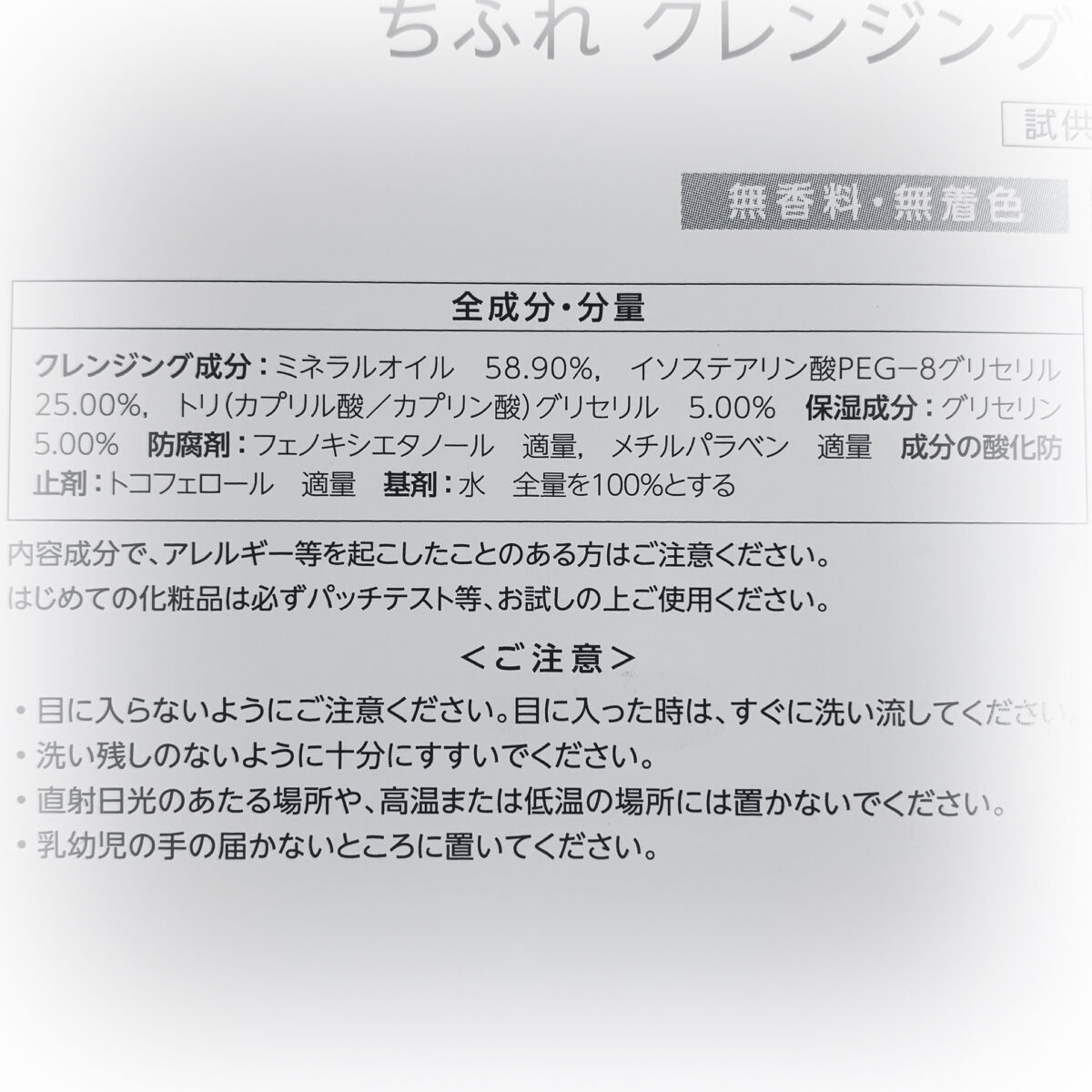 - クレンジング成分 ミネラルオイル58.90%、〃 イソステアリン酸PEG-8グリセリル25.00%、〃 トリ(カプリル酸/カプリン酸)グリセリル5.00%、保湿成分 グリセリン5.00%、防腐剤 フェノキシエタノール適量、〃 メチルパラベン適量、成分の酸化防止剤 トコフェロール適量、基剤 水全量を100%とする
