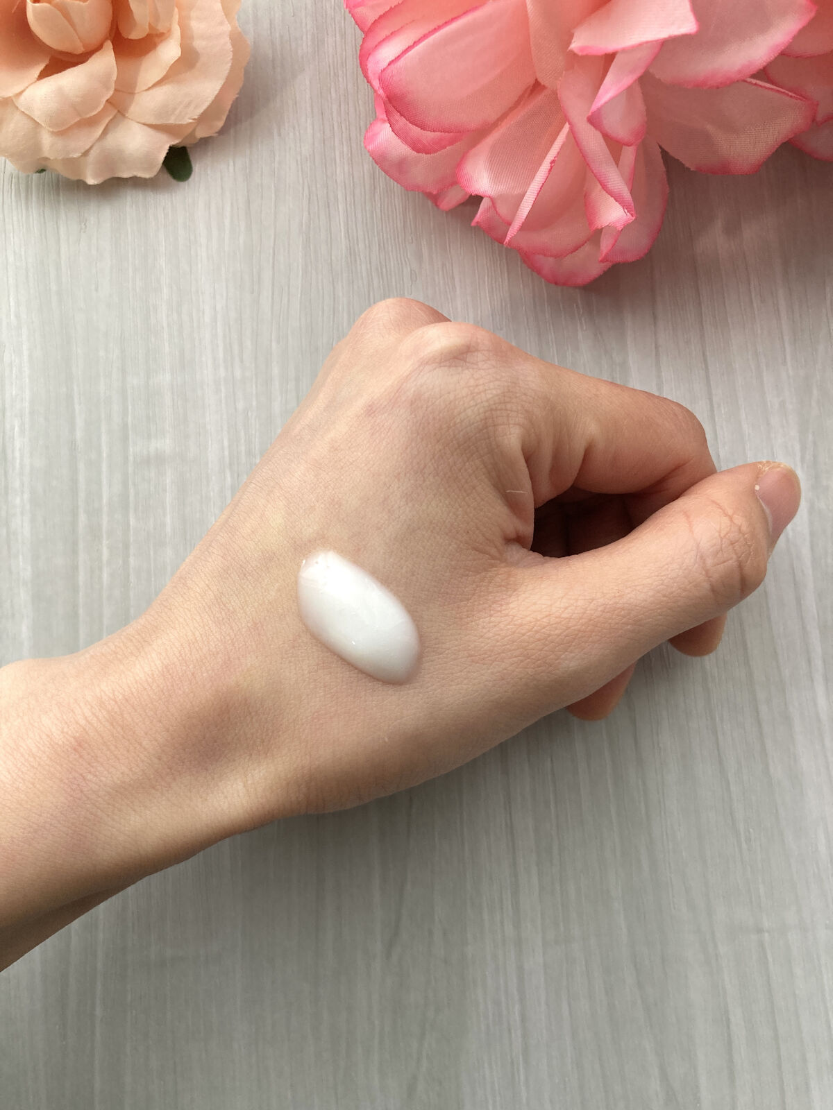 さらさらで伸びが良いテクスチャー。 肌への密着感もあって、ピンクベージュの色みが毛穴のカバーとほんんのりトーンアップも。 クリームのようなテクスチャー。 肌にのせすぎると白っぽくなるので、少しずつ伸ばすのが◎ なめらかテクスチャー。 細かいパールが入ってますが、ギラギラしたりもなく自然な感じ。