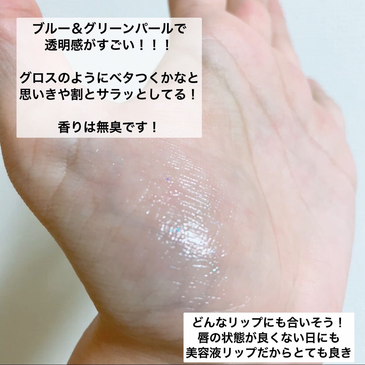 - 透明感のある、軽い付け心地の美容液リップ。 2色の寒色パール入り透明ジェルが、くすみの気になる唇に透明感を与えます。 美容保湿成分(スクワラン、ヒアルロン酸Na、マンゴー種子脂、オリーブ果実油、マカデミア種子油)配合。 みずみずしいオイルベース処方で、べたつきにくい処方。 単体でも重ねても使える、色のつかないタイプ。 程よくしなり、唇へのフィットを考えた使いやすいスクエア型チップ。