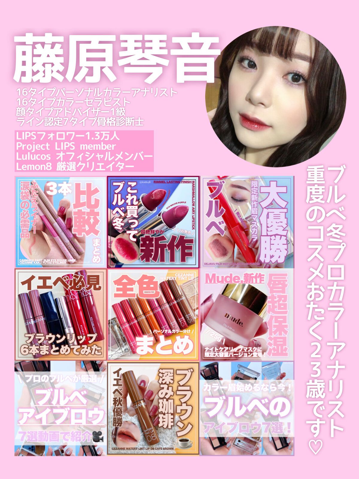 このバームはワセリンのようなとにかくうるうるの透明ツヤ感で、唇に負担なく薄づきの発色です💓 やや黄みの柔らかいヌードベージュ 明るさが得意なイエベ春におすすめ! 明るく澄んだ青みピンク 明るさが得意なブルベにおすすめ! やや黄みの澄んだコーラルレッド 2ndブルベのイエベ春におすすめ! 鮮やかで澄んだ青みレッド 鮮やかさが得意なブルベにおすすめ! 柔らかいくすみベージュブラウン 柔らかい色が得意なイエベにおすすめ! やや青みの柔らかいくすみレッド 柔らかい色が得意なブルベ夏に! しっかり青みのモーブピンク 1st2ndブルベにおすすめ!
