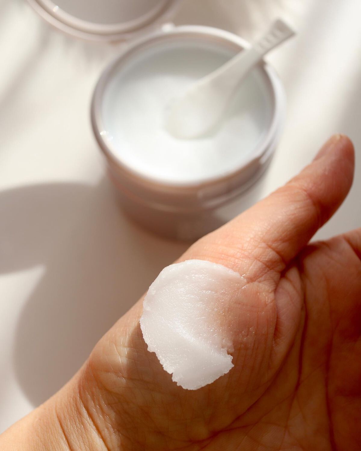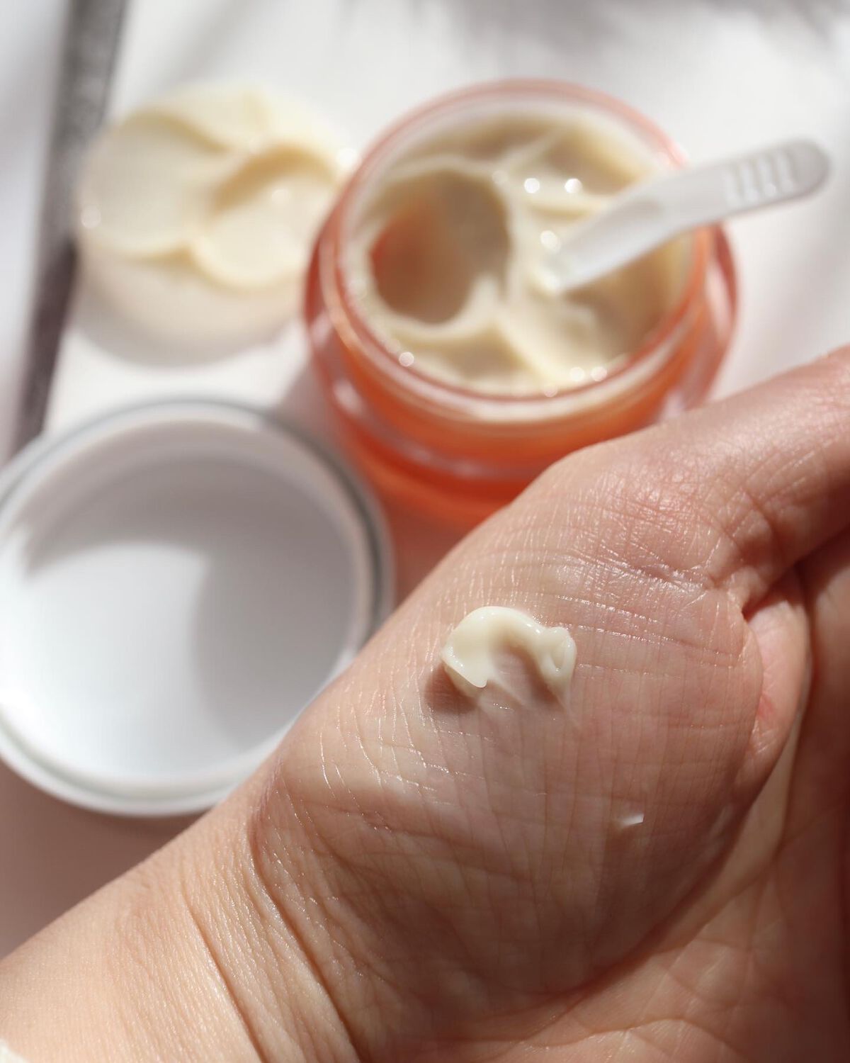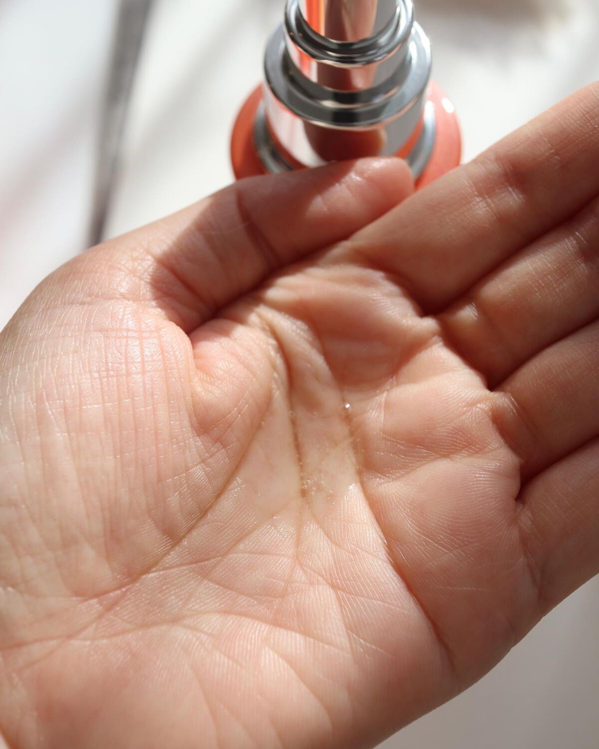 贅沢に美容成分を配合しているクリームは思ったより軽く、みずみずしく、素肌によくのびます。べとつきはしないかな。 プッシュしてエアレスボトルから新鮮なクリームが出てくるから量も調節しやすい🙆♀️ クリームはジェルのようにみずみずしいよ。少し高級化粧品によくあるような独特の香りがします。 ピンク色のエアーレスのボトル プッシュするとクリームが出てきます。