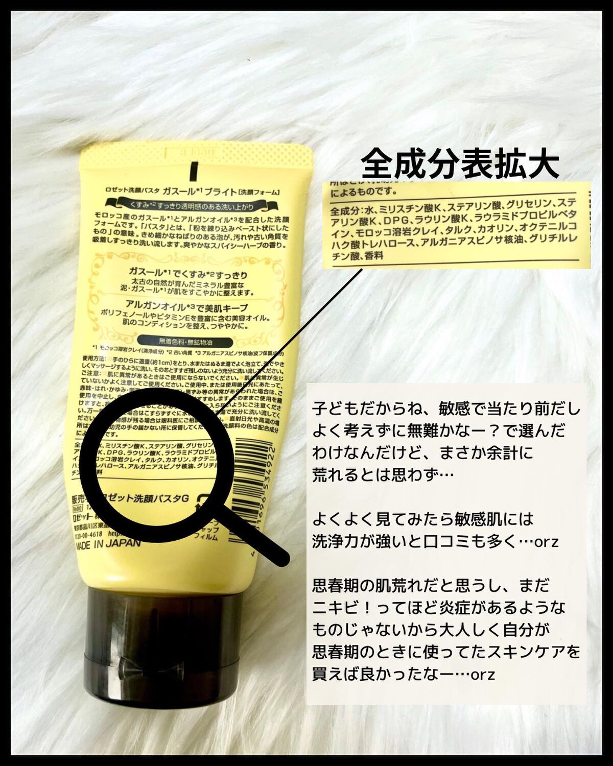 - <120g> 水、ミリスチン酸K、ステアリン酸、グリセリン、ステアリン酸K、DPG、ラウリン酸K、ラウラミドプロピルベタイン、モロッコ溶岩クレイ、タルク、カオリン、オクテニルコハク酸トレハロース、アルガニアスピノサ核油、グリチルレチン酸、香料