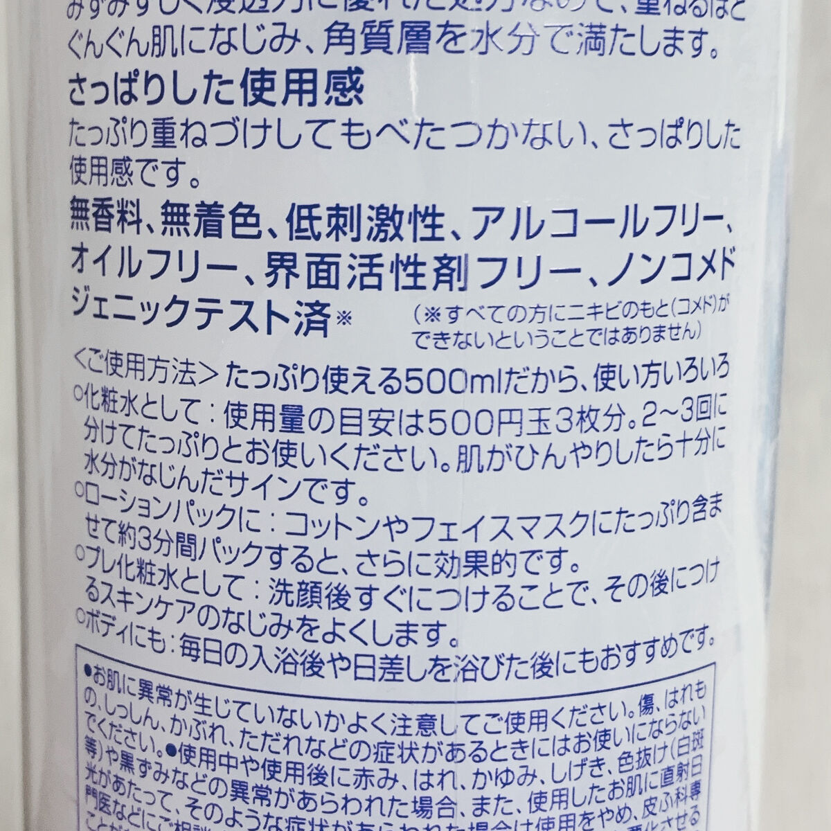 - 肌にうるおいを与えてスキンコンディションを整える、天然保湿成分ハトムギエキス配合の化粧水です。 みずみずしく浸透力に優れた処方なので、重ねるほどぐんぐん肌になじみ、角質層を水分で満たします。 たっぷり肌に重ねづけしてもべたつかないさっぱりした使用感なので、スキンケアのはじめにたっぷり使ってください。 肌がひんやりしてきたら十分に水分がなじんだサインです。 ■基本は化粧水として スキンケアのはじめにたっぷり使ってください。 500円玉大の量を3回重ねづけするのが目安です。 肌がひんやりしてきたら十分に水分がなじんだサインです。 ■ローションパックでさらにうるおい コットンやフェイスマスクにたっぷり含ませて約3分間パックすると、角質水分量がさらに高まります。 ■プレ化粧水として 洗顔後すぐにつけることで、その後につけるスキンケアのなじみをよくします。※角質層まで ■ボディにも べたつかないので、毎日の入浴後や日差しを浴びた後などのボディのスキンケアにもおすすめです。