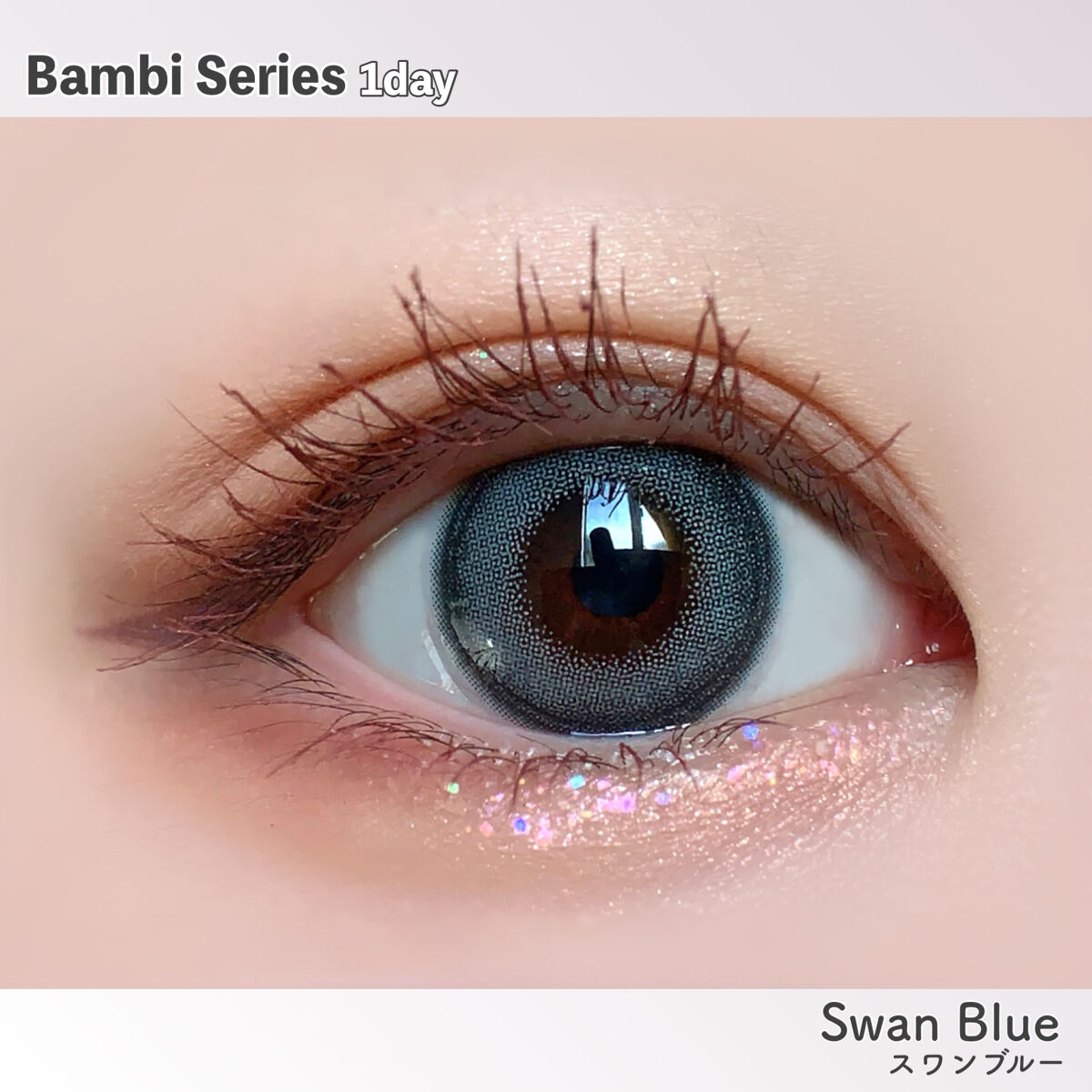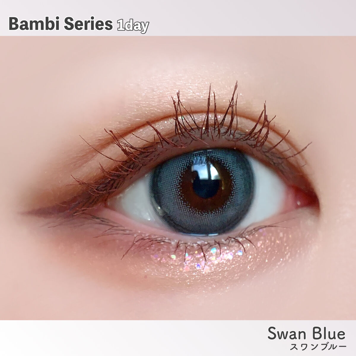 青コンといえばこれ!な益若つばささんプロデュースのバンビシリーズのスワンブルー!まるでドールのようなちゅるんとしたデザインで可愛さMAX♡ 大きめサイズのレンズと二重のフチリングで存在感がありながらもふんわりとしたブルーカラーでスイートな瞳に♡ DIA14.1mmサイズもあるのでなりたい雰囲気に合わせて好きな方選べるのも嬉しい!
