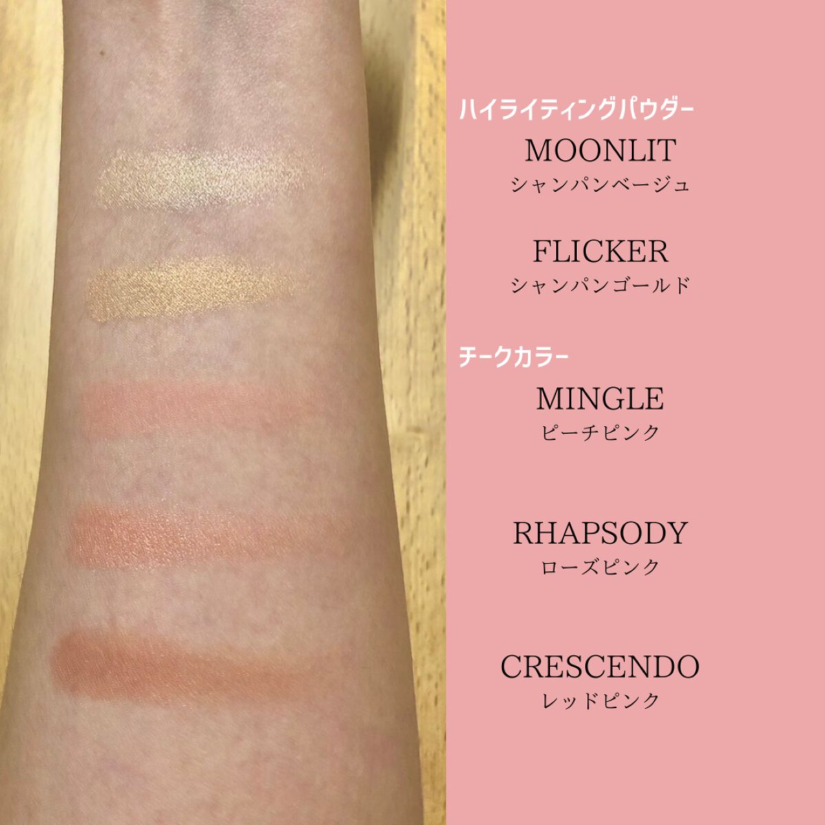 ハイライトカラーはMOONLIT,FLICKERの2色で,粒子が細かく自然に仕上がります. MOOLITは美しいツヤ感を,FLICKERはより華やかに演出してくれます. チークカラーはMINGLE ,RHAPSODY ,CRESCENDOの3色です. MINGLEはマットな質感で可憐な雰囲気に, RHAPSODYとCRESCENDOはさりげないラメが入っており,自然な血色感が得られます. 5色も入っているのにどれも素敵でかつすべて限定色なので,かなりお得なパレットになっていると思います. 色味の違うチークが3色も入っているのでメイク初心者さんにもおすすめです.