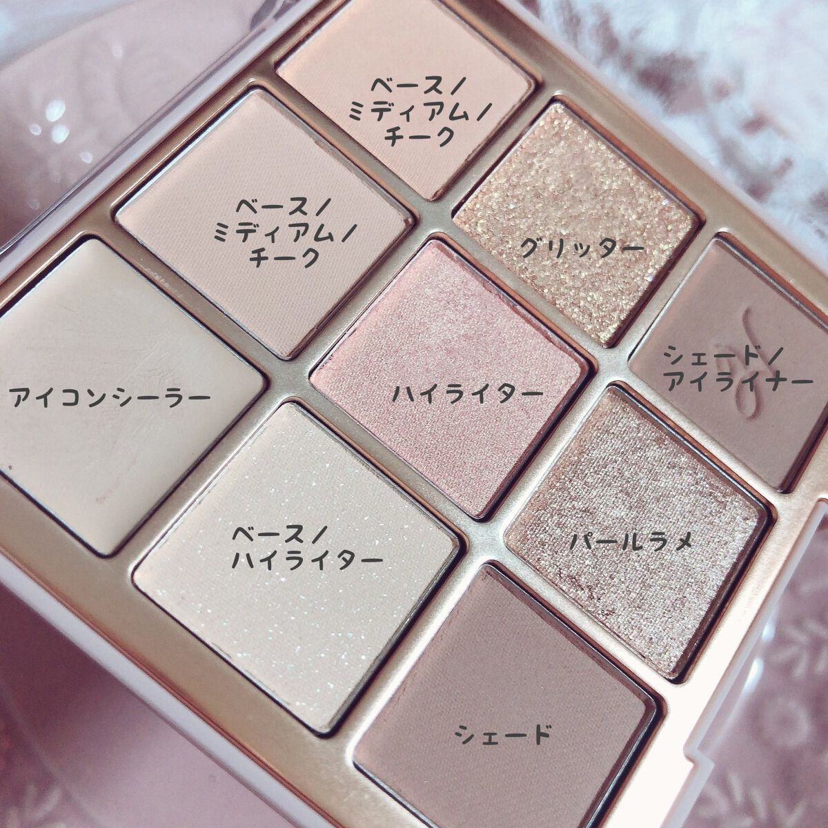 - 涙袋用コンシーラー入りの9色アイシャドウパレット。涙袋用コンシーラーや涙袋の影カラー、涙袋を立体的にみせるハイピグメントのラメやハイライターが入った9色パレットです。これ1つで様々なニュアンスの「涙袋メイク」や「下まぶたメイク」を楽しめます。