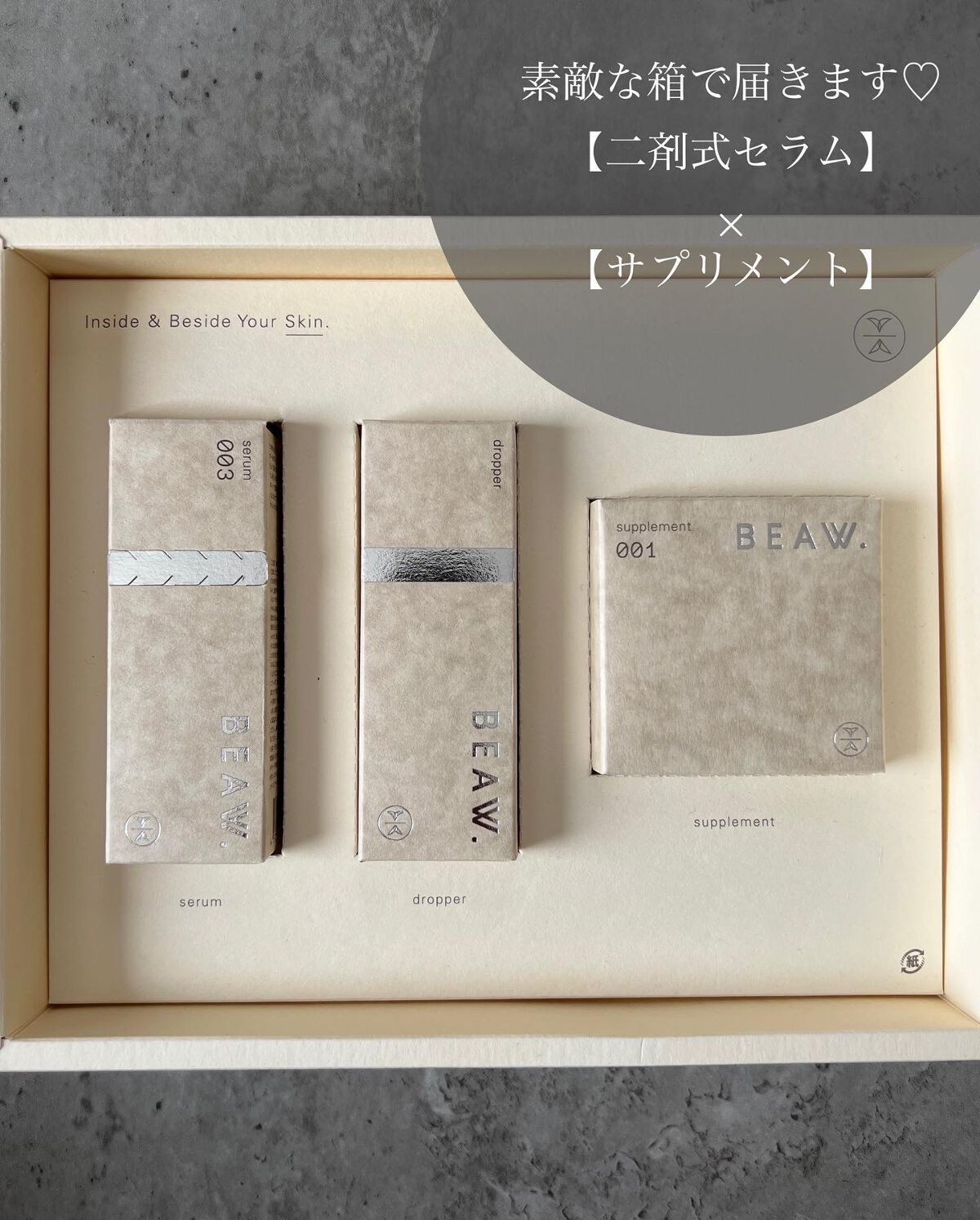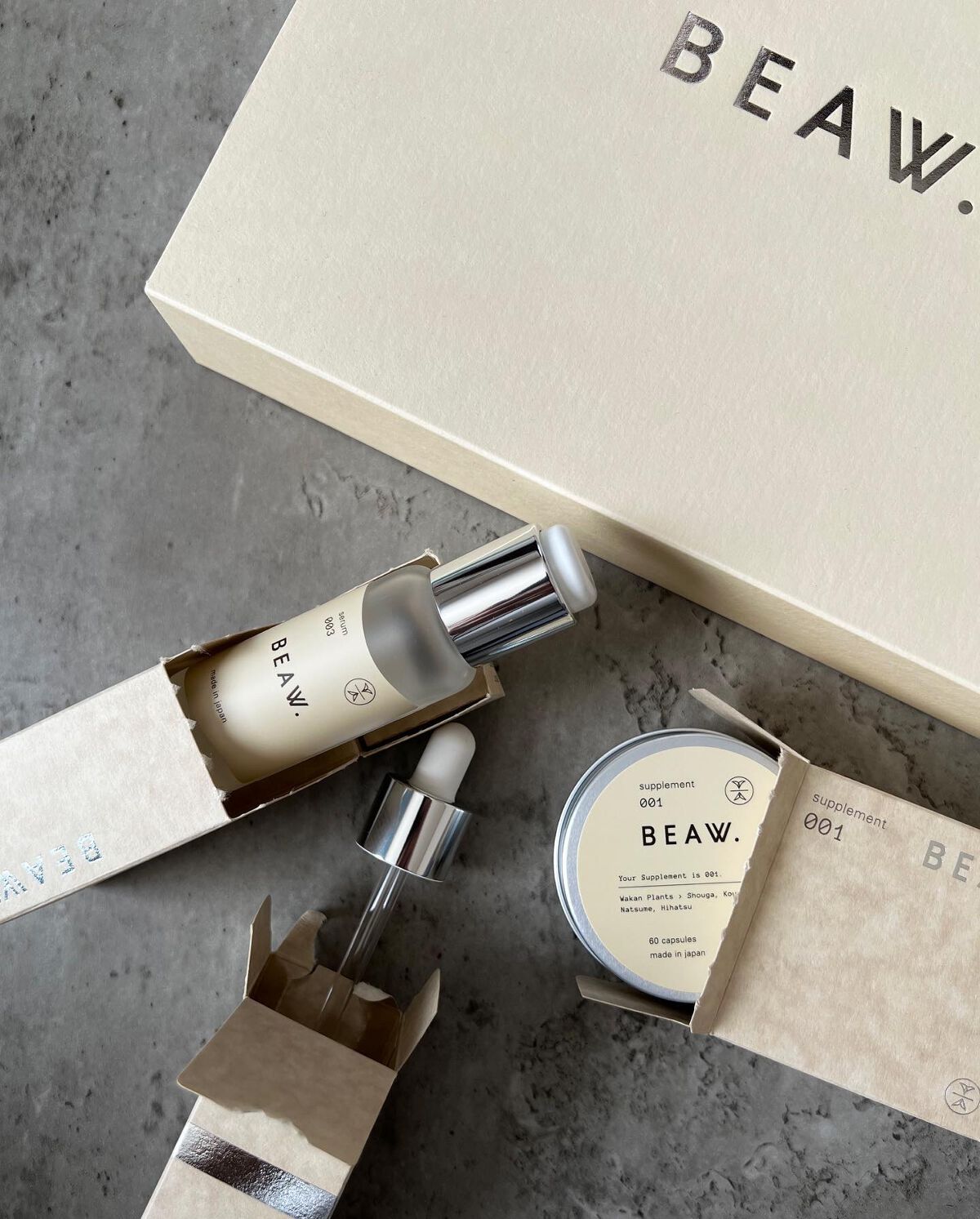 - ・BEAW.のパーソナライズケアは始めにパーソナライズ診断を行い、20種類の和漢と、自然由来の保湿成分の組み合わせから、一人ひとりに合わせた製品をお届けします。 ・現在の自分の悩みにぴったりのパーソナルケアキット、和漢植物由来成分を配合した2剤式のセラムとサプリメントのセットでお届けします。からだの内と外から同時に理想の美しさをめざせるデュアルケアで、あなたの美容をサポートします。 ・美容液は、肌荒れ予防、乾燥、毛穴、テカリ、くすみ*、年齢肌、ツヤ肌、などその人それぞれの悩みに対して適した処方で国産和漢植物成分と、植物エキス、ビタミンやセラミド、プラセンタ、ナイアシンアミド、などを配合した保湿成分を分析結果に合わせて配合。*乾燥による ・サプリメントは体の内側からキレイをサポートする国産和漢植物成分と20種類以上のビタミン、ミネラルをそれぞれに合わせて配合。 -対象商品- BEAW.リッチセラム003、008、015 BEAW.サプリメント:001、007、031 BEAW.フェイスウォッシュ:019、026、045 -内容量- BEAW.リッチセラム:30ml BEAW.サプリメント:60粒 BEAW.フェイスウォッシュ:80g