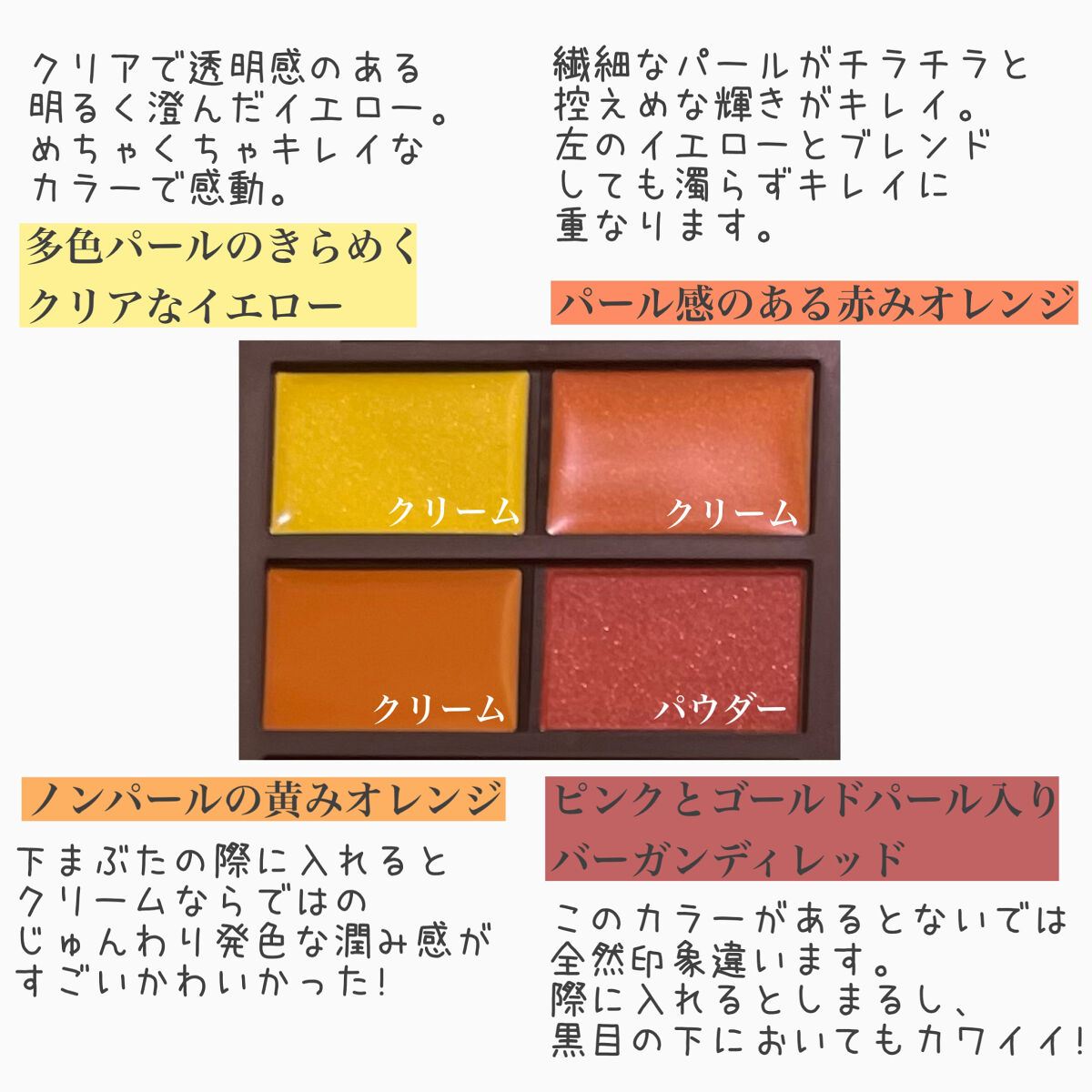 ジューシー発色なパレットです✨ この左上のスパークルがこのパレットを「無難」ではない 「ちょっと攻めた」夏のかわいさ(語彙力…)のある パレットにしてくれてる気がします🤭✨ ソフトな発色のベージュピンク シアーなコーラルオレンジ(サーモンピンク、というよりコーラルオレンジ、という印象🤔) 偏光カラーのパール入り 目元にのせてみるとパレットで見た印象より 青み感がなく、イエベの私も使いやすい印象でした。 このカラーを使うと一気に深みが。 使わなければ全体的にコーラルオレンジ感が出て、 よりジューシーで夏らしい感じに✨