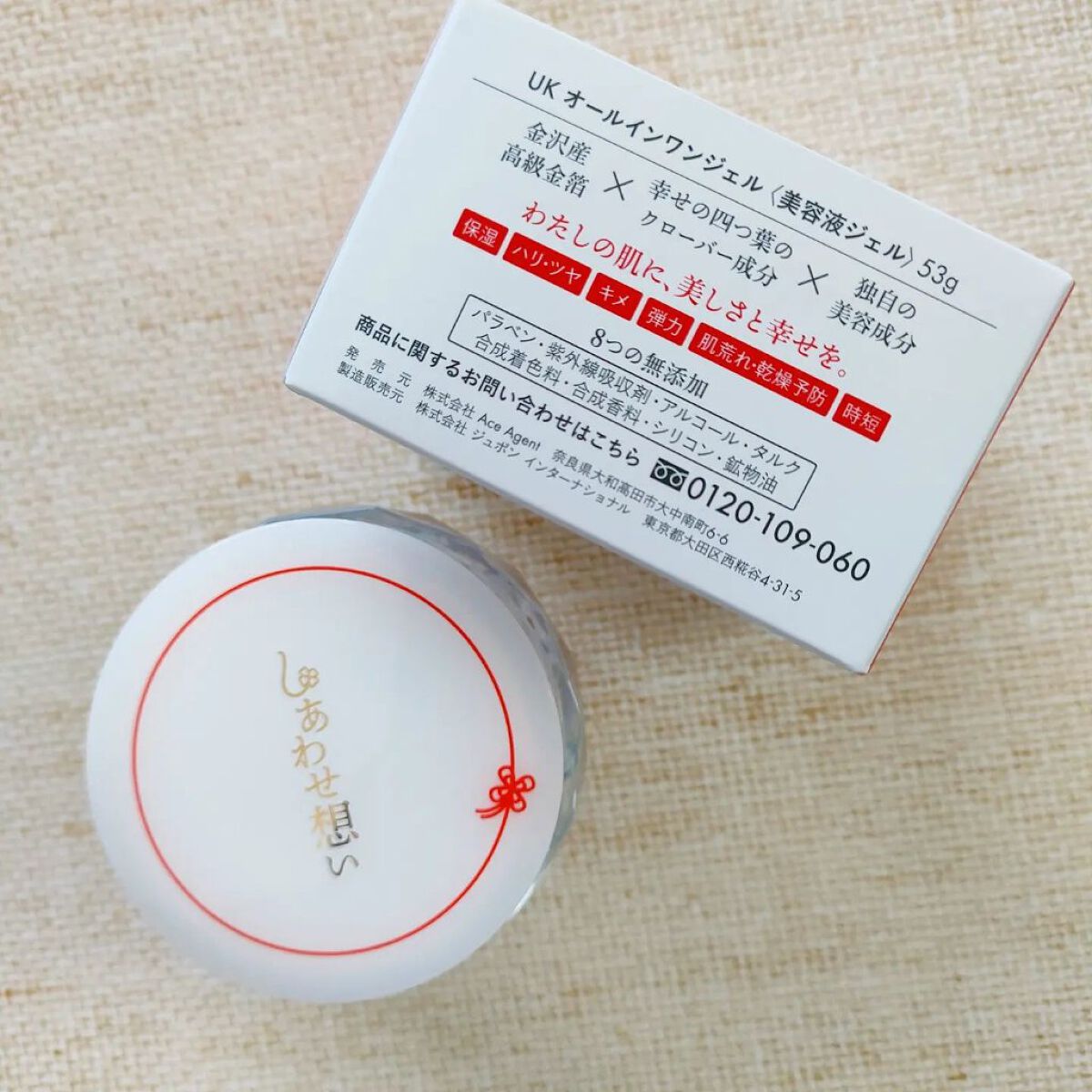 《幸せ感じる四つ葉のクローバー成分入り!?》朝から幸せな気分になれるスキンケア発見です❣️『しあわせ想い オールインワンジェル』ぷるんぷるんのゼリーの様なジェルの中にキラキラっ✨の高級な金箔が!👀金沢産の高級な金箔と幸せの四つ葉のクローバー成...