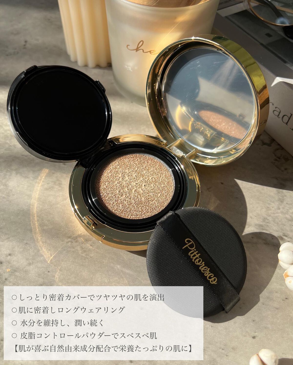 Pittorescoは韓国のインフルエンサーさんやアイドル、女優さんに愛されているコスメブランドなんだって! ミストBBクッションはとにかく潤いがたっぷりで簡単にツヤ肌に仕上がるよ👍 カバーBBクッションはより密着感に優れていて気になるアラをカバーしてくれるよ!! 使ってみた感じ、どちらもカバー力は高め!僅かにカバーBBの方が重ねてカバーできるかな?っていうくらい! カバーBBの方がテクスチャー的なものもあってミストBBより気持ち色は明るく見えるかも!