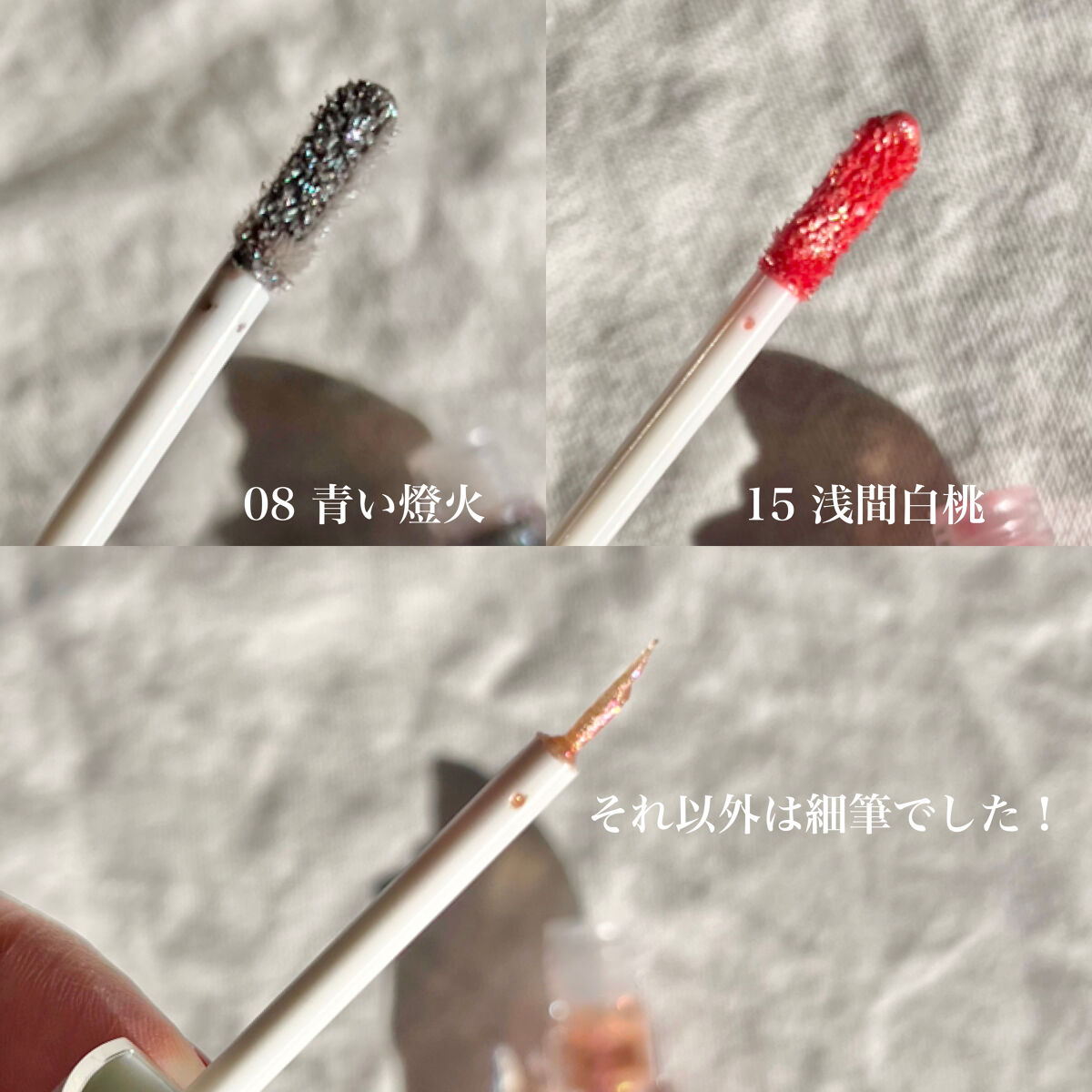 ロムアンドは細かいラメがたっぷりタイプ。 ゴールドとピンクのラメ。1番ラメが細かくて上品なので大人でも◎ ラメのサイズが小さい分落ちたのもわかりずらくて良い。 ZEESEAは液もピンク色なので存在感あり。 ラメはピンク、パープル、オレンジ、グリーンに見えます。1番華やか! カラフルにしたいならZEESEA✨ 耐久性は、アンリシアがNo.1👑 私は普段使いならロムアンド、イベント使いはアンリシアがいいなって思いました!