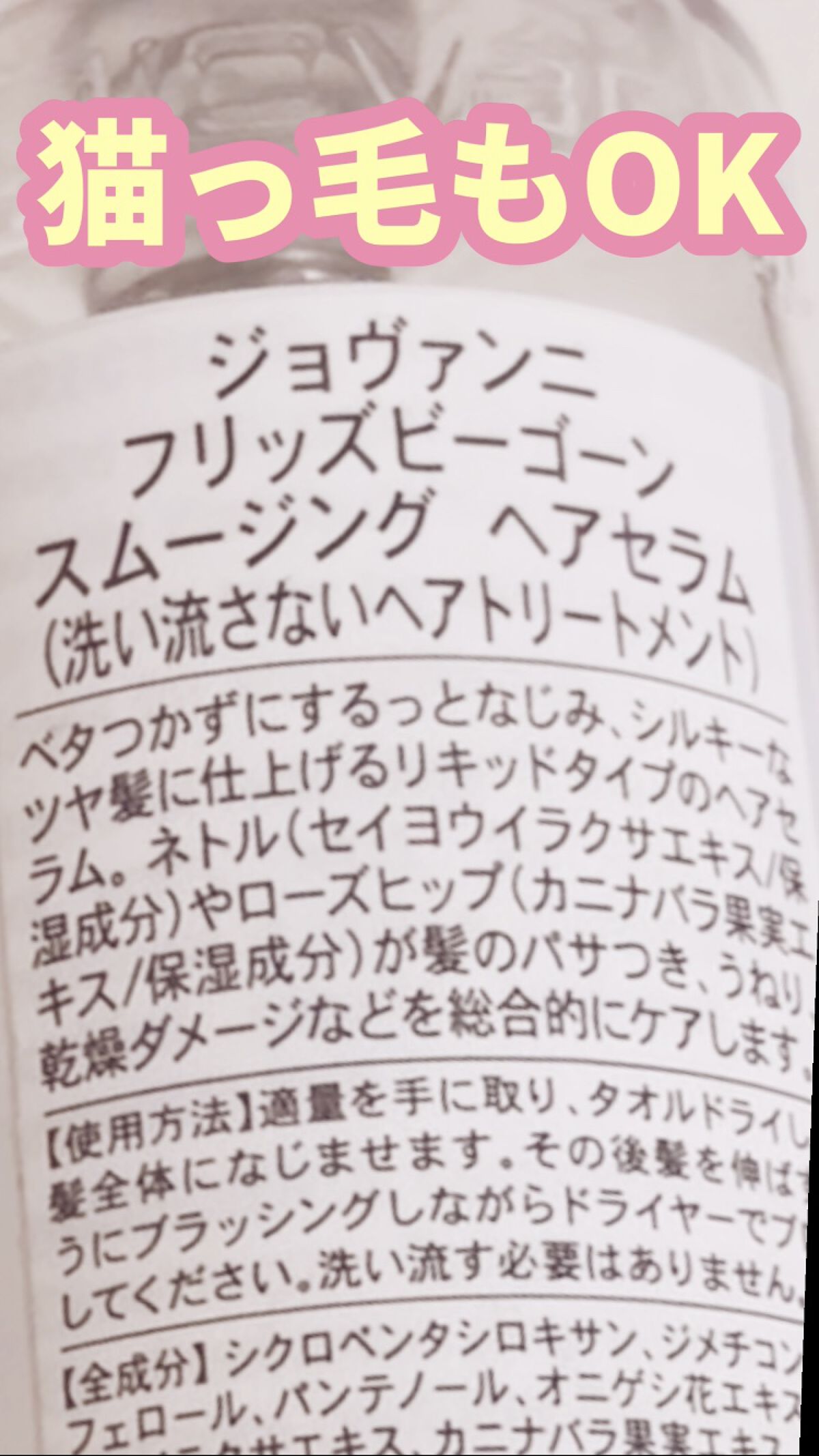 ジョヴァンニフリッズビーゴーン スムーズヘアセラム☀️使い切りです🌟洗い流さないヘアトリートメントで、タオルドライした髪に付けてドライヤーをします♪乾いた髪にも使えるそうです🌼出してみるととろっと粘り気があり重めに感じるオイルですが、髪に載せ...