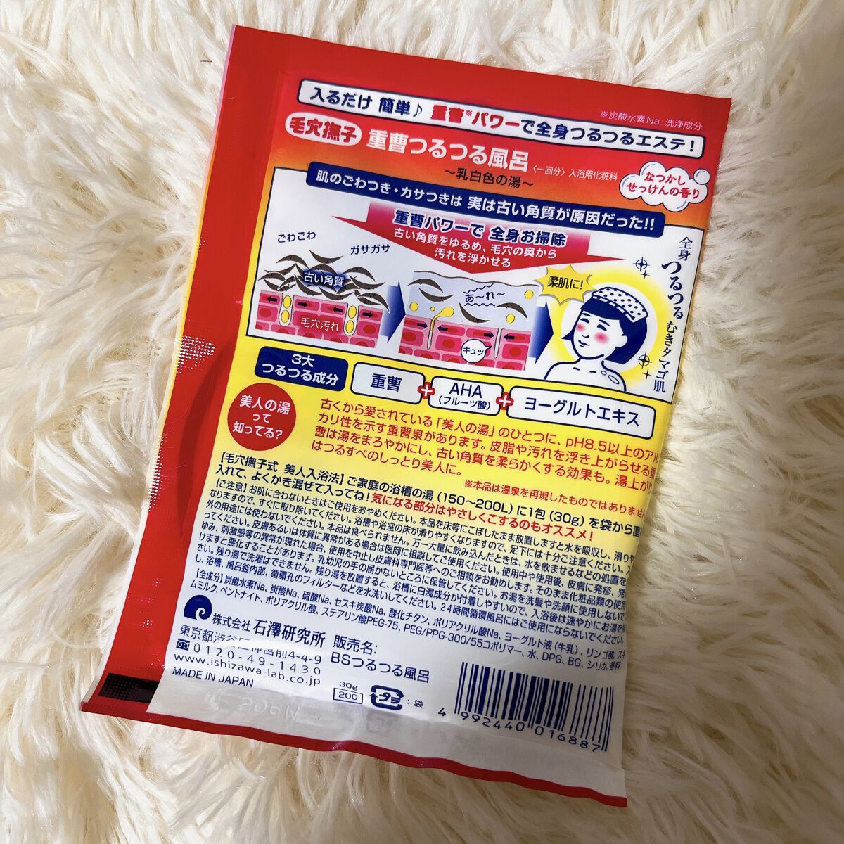 - 重曹パワーで全身つるつるエステ!皮脂や汚れを浮き上がらせる重曹は湯をまろやかにし、古い角質をやわらかくする効果も。さらにAHA(フルーツ酸)が厚く積もった角質をやさしくピーリング。●ヨーグルトエキスがうるおいをあたえながら、なめらかでスベスベの肌に整えます。全身つるつるむきタマゴ肌に。なつかし石けんの香り。乳白色の湯。 ※重曹:炭酸水素Na(洗浄成分)