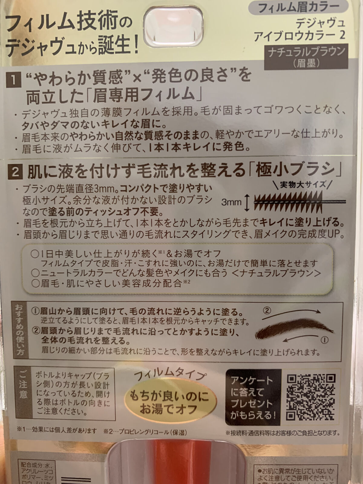 - \\25年3月定番新色モカグレージュ発売// 「フィルム眉カラー」なら眉の印象を自然にやわらげ、ふんわり質感の垢抜け眉に! 1.塗りやすい極小ブラシ ・ 先端直径3mmで、地肌に液がつきにくく根元から色づける ・余分な液がつかない設計で、ティッシュオフ不要 2.眉専用フィルム液 ・眉毛1本1本にキレイに色付き、自眉の黒さをやわらげる ・タバになったり、パリッと固まったりせず、まるで自眉のような仕上がり ・皮脂・汗・こすれに強いのにお湯で簡単オフ (※2025年9月以降、商品パッケージをリニューアル。)