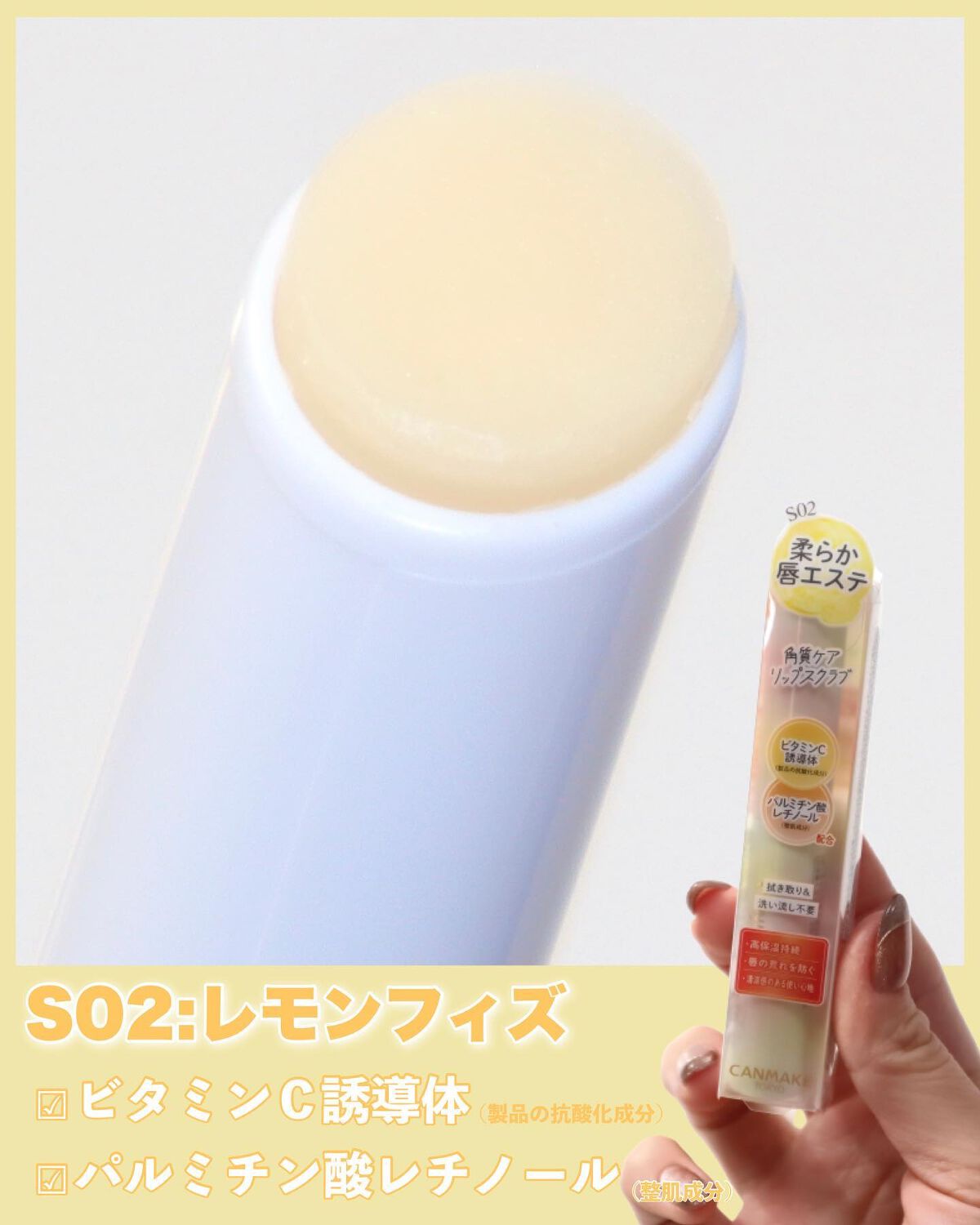 - うれしい成分をプラスした うるおい&角質ケアができるリップスクラブ S01…ヒアルロン酸Na(保湿成分)・セラミドNP(保湿成分) 配合 S02…ビタミンC誘導体(製品の抗酸化成分)・パルミチン酸レチノール(整肌成分) 配合 S03…ドクダミエキス(整肌成分)・ツボクサ葉/茎エキス(整肌成分) 配合 プランプリップケアスクラブに各色2種ずつ成分をプラスしたタイプ。 唇の上で溶けるお砂糖のスクラブが古い角質を優しくオフして、なめらかな唇に整えます。 リップパックした後のような高保湿が持続します。 拭き取り・洗い流し不要なので、外出先でも手軽にケアできます。 ナイトケアにもオススメです。 清涼感のある使い心地 ・スクラブ目的として砂糖の粒子を配合しておりますが、唇の状態によって刺激に感じられる可能性がございますのでご注意ください。 ・強くこすると刺激を感じることがあります。こすりすぎないように注意してください。 ・大変柔らかいバームですので、1㎜程度繰り出してお使いください。 ・一度繰り出したバームは戻りませんのでご注意ください。