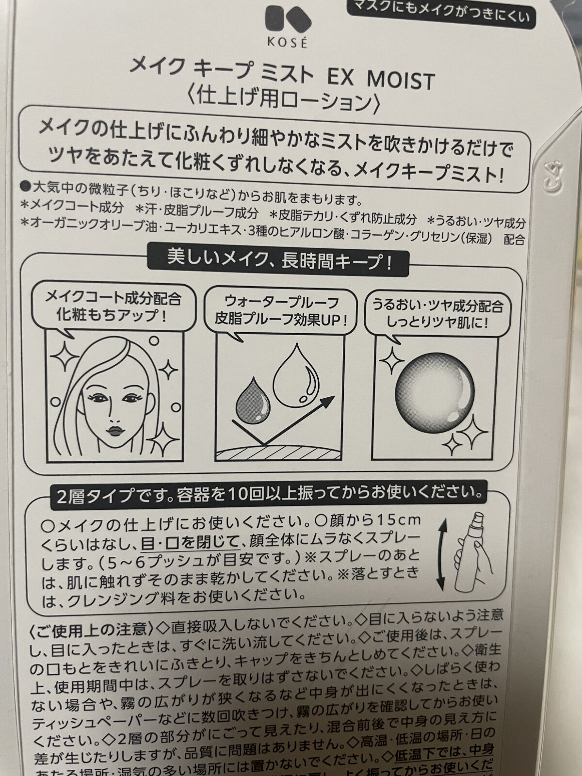 - メイクキープ力がパワーアップ! メイクの仕上げにサッとひと吹き、化粧くずれを防ぐふんわりミストスプレー。 メイクキープ力がパワーアップ! ウォータープルーフ効果に加え、皮脂くずれ防止効果で驚きのメイクキープ力を発揮します。 ● さらに細かくふんわりと噴霧するミストに進化。均一な一枚の膜を作ります。 ● つけたての美しいメイクを長時間持続。 メイクコート成分配合。しっかりとメイクを固定しながら、顔の動きに合わせて伸縮するため、時間がたってもメイクがヨレにくく、美しい仕上がりを長時間持続します。 ● マスク着用によるメイクのヨレを防止し、マスクにメイクが付きにくくします。 ● メイクくずれから守るだけでなく、大気中の微粒子(ちり・ほこりなど)からも肌をまもります。 ● 汗や水、皮脂まではじくため、メイクによるテカリやにじみをしっかりと抑えます。 ● 保湿成分配合。うるおいを与えて乾燥を防ぎます。 ● フレッシュフローラルの香り ● 無着色 <ご注意> 低温下では中身が白く固まりやすくなりますが、 常温に戻すために湯せんや電子レンジなどを使って高い温度で温めると品質が変化してしまいます。 さらには容器が変形・破損することで、やけどや怪我の恐れがあります。 大変危険ですので、湯せんや電子レンジなどを使って加熱することは絶対にお避けください。