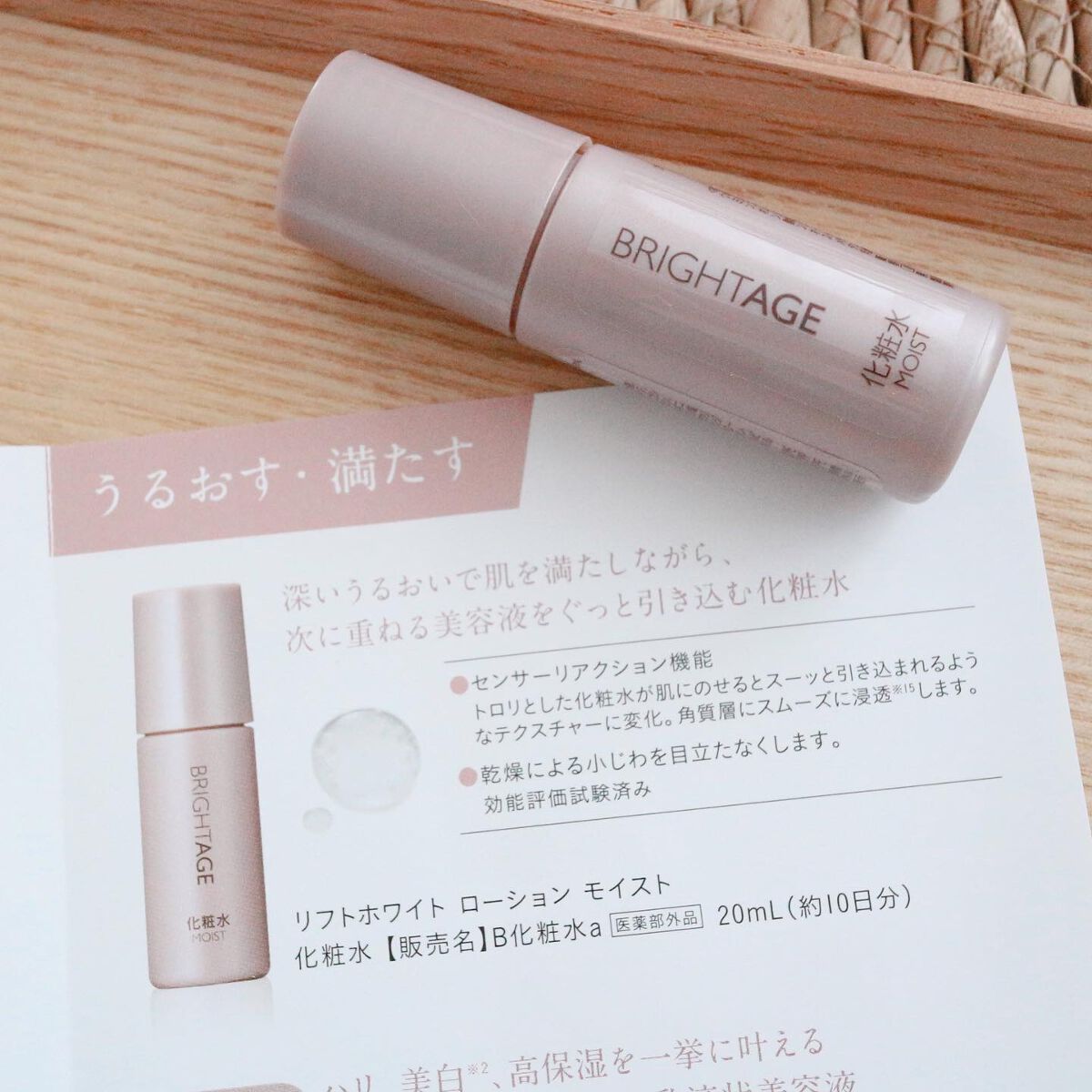 ブライトエイジは、製薬会社である第一三共ヘルスケアが、研究と技術の粋を集めて開発したスキンケアシリーズ。リフトホワイト ローション モイストは、薬用有効成分である「トラネキサム酸」と「グリチルリチン酸2K」をWで配合し、様々な年齢肌悩みの根本原因にアプローチしてくれる商品となっています。 リフトホワイト ローション モイストは、ハリ・美白・高保湿の全てにアプローチし、ふっくら・もっちりした透明感あふれる肌に導くことが期待できます。 高保湿設計で、冬の乾燥が気になるお肌にうるおいを角質層までチャージしてくれる感じ。しっとりとした使用感です。
