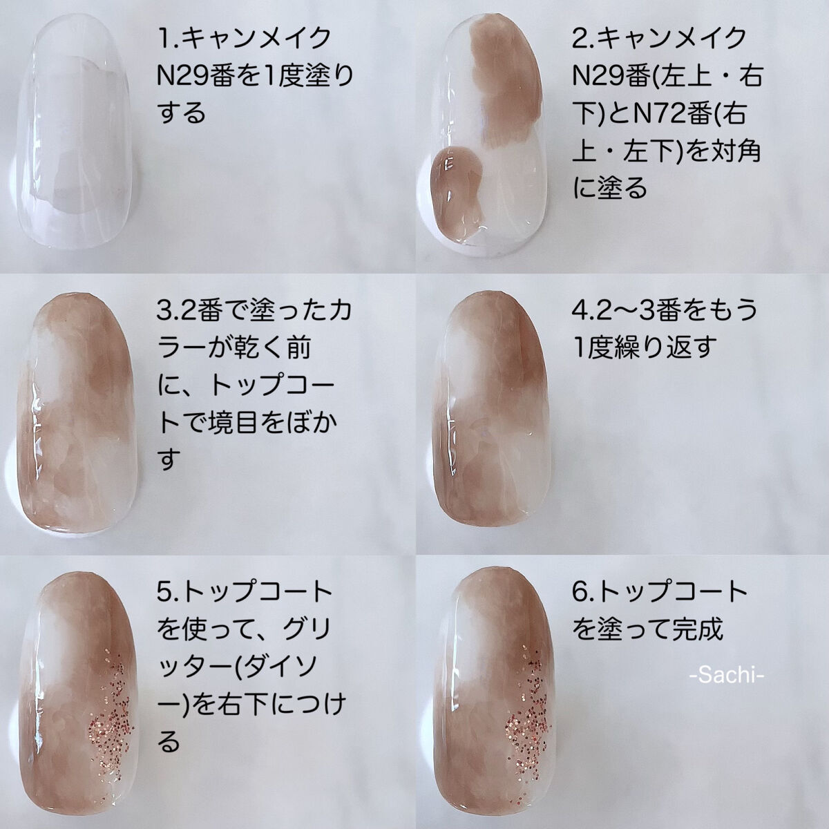 ワンカラーでも指ごとに色を変えるだけでオシャレに見えます💕 画像のようにゴールドラインとストーンを少し足すだけで華やかさがアップ🥰 何度かご紹介したことのあるスポンジで作るグラデーションです✨ スポンジを使うことで境目が綺麗に馴染んでくれます💕 アルミホイルの上でブラウンとトップコートを1:1くらいで混ぜたものを、トップコートのハケに取って3箇所に塗るだけ👌 事前に混ぜたものを塗ることで、爪の上でぼかすより簡単に出来ます💕 ベースカラーが乾く前に点置きしてぼかすことで綺麗にぼかせます✨ スピードが大事なので、使うポリッシュのキャップは全て開けておきましょう😊 天然石のラインはガタガタの方がより天然石っぽく見えるので、ラインを描くのが苦手な方でも大丈夫🙆♀️ 難しそうに見えて、やってみると意外と簡単に出来ます♡