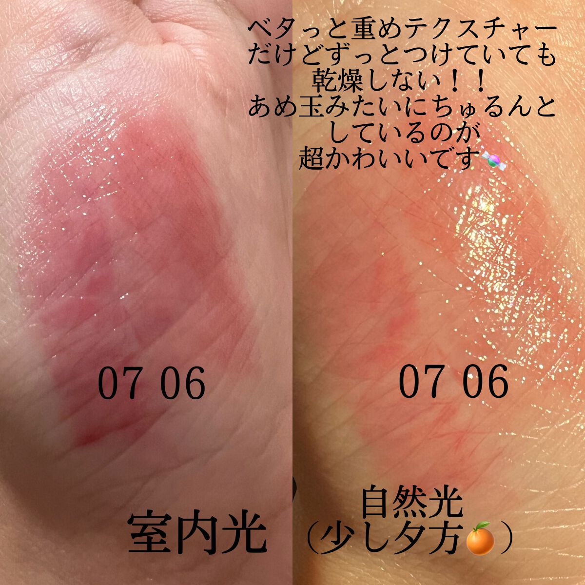 - もちっとした水膜で弾けそうなツヤリップ 1.軽い塗り心地のなめらかで透明な水爆弾ツヤ 2.塗った瞬間から唇を鮮やかに彩る多彩なカラーバーム 3.植物性保湿オイルでしっとりもっちり保湿バーム