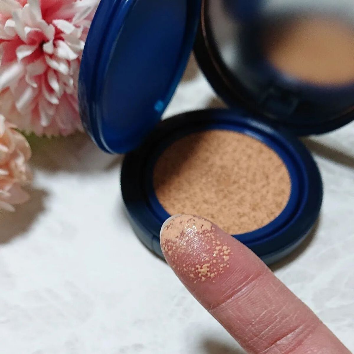 クッション部分はしっかりとファンデーションが染み込んでいて、触るとジュワッとするような感覚です。 ツヤ感のある綺麗な仕上がりで、カバー力もあるように思いますが厚塗り感がないのが嬉しいなと思います✨ 薄付きに仕上げられるのですが重ねても重たくならず、仕上がりがとにかく綺麗で肌への密着も良いように感じました。 付けていて肌への圧迫感も感じませんでしたし、使い心地も良くとても気に入りました😊