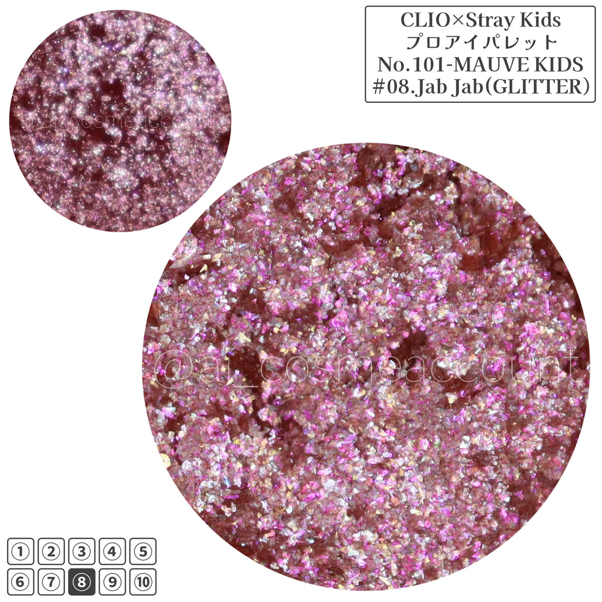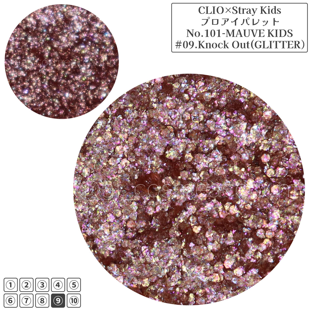 [CLIOPROEYEPALETTE全色スウォッチ]CLIOプロアイパレットの1号〜10号と、StreyKidsコラボ限定色の100号・101号の全色スウォッチです。フラッシュ撮影の全色スウォッチはコチラ↓https://lipscosme....