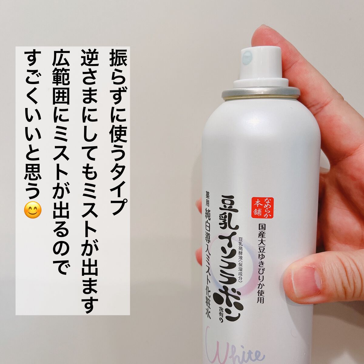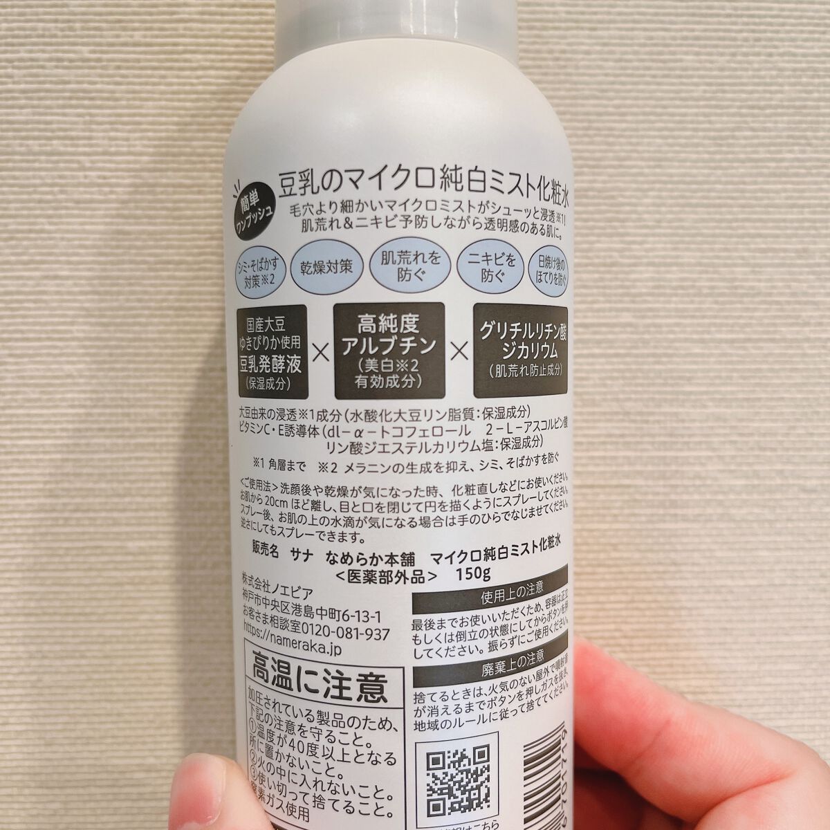 - 【医薬部外品】 ① 肌荒れ・ニキビ予防・美白*2 北海道産大豆「ゆきぴりか」を使用した豆乳発酵液※1 に加え、美白*2 有効成分アルブチン、ニキビ・肌荒れ防止有効成分※3 配合でお肌にうるおいと透明感を与えます。 ② 超微細ミストで導入ケア 毛穴より細かく、肌あたりの良いマイクロミストが角層まで浸透し、うるおいのあるお肌に導きます。 大豆由来の浸透※4成分※5がお肌に必要な油分と水分の両方を引き付けながらうるおいを補給! 化粧水やオールインワンジェルの前の使用がおすすめです。 ③ 全身にもより使いやすく! 倒立(逆さ)での使用も可能になり、背中など全身にも、よりお使いいただきやすくなりました。 ④ こだわりの処方 無香料、無着色、無鉱物油のこだわりの処方。 *2 メラニンの生成を抑え、シミ・そばかすを防ぐ ※1 保湿成分 ※2 セラミドNG(保湿成分) ※3 グリチルリチン酸ジカリウム ※4 角層まで ※5 水酸化レシチン(保湿成分)