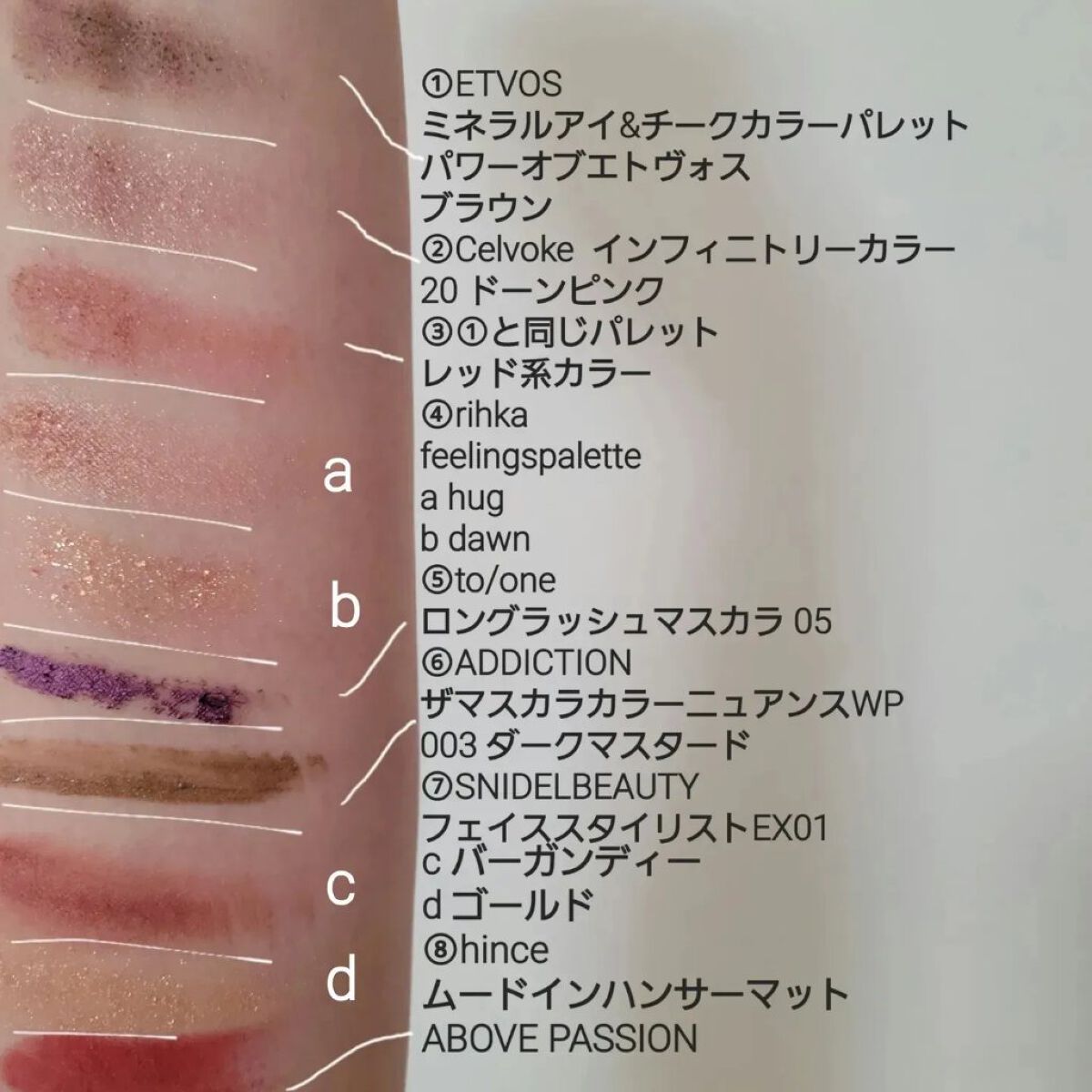アイブロウは #WHOMEE のレッドブラウンを。 アイメイクは ①#hince の #ニューデップスアイシャドウ イニシャルを上下の瞼に馴染ませる。 ②#snidelbeauty の #フェイススタイリスト の a バーガンディを上瞼の際に 目尻から黒目上あたりまで。 b マスタードを同じく上瞼の際の目頭から 黒目上あたりまで。 c スパークリングゴールドを下瞼の黒目下に。 d フロステッドシルバーをcの両隣に✨ リップとチークは ④#rmsbeauty の #ラプチャー を唇にポンポン塗りにする。 指で馴染ませたら、指についてる残りを頬にも♡ ヘアスタイルは ちょっと変化を付けたくて 少しコテを使って ウルフっぽい形に。 アルジェランの ヘアバームとヘアオイルをほんの少し MIXしてスタイリング💆 #アルジェランヘアバーム → 9/11発売! #モイストグローヘアオイル →既に発売されているもの アウトバスだけでなくスタイリングにも オススメです🙆