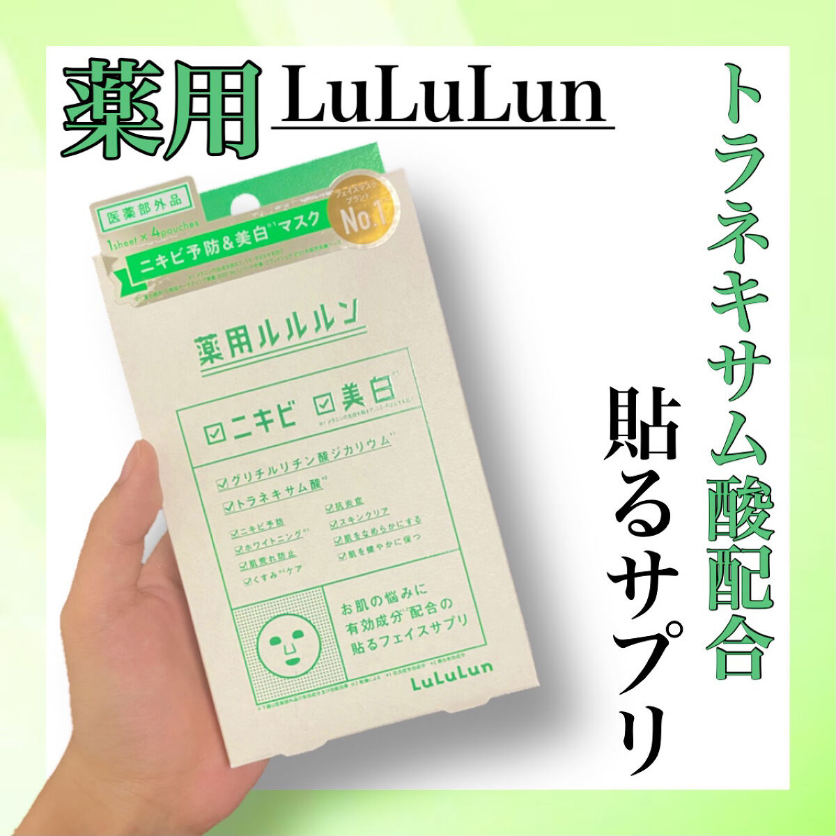 - 【医薬部外品】 ルルルン初の医薬部外品、「薬用ルルルン」が登場。 「薬用ルルルン 美白アクネ」はニキビを予防したい方、美白※1・くすみ※2をケアしたい方におすすめ。 (※1 メラニンの生成を抑えて、シミ・そばかすを防ぐ ※2乾燥による)