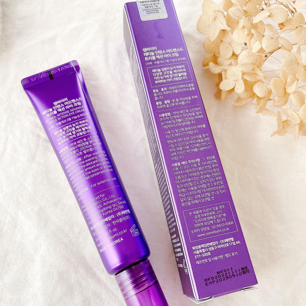 レチノール0.1%+グルタチオン配合で目のくま・小じわを集中ケア 目元以外にも口元や眉間などにも使えて、さまざまなシワ悩みにアプローチしてくれます💜 柔らかくよく伸びるクリームで、結構しっとり感があるような使用感 べたつかずしっかり保湿される使用感なのが嬉しいです💕 この紫パケが特徴的 それぞれの肌に合わせて、使用量などを調整して使うのが大切かなと思います。