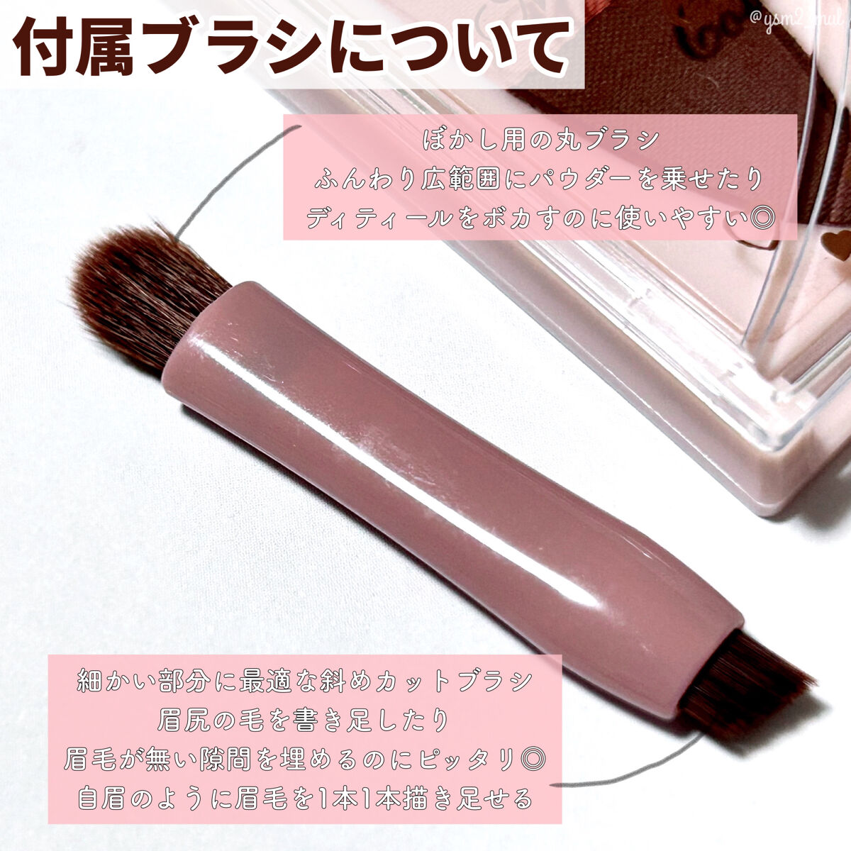 - ベーシック眉もトレンド眉も叶う!ニュアンスカラーがかわいいアイブロウパウダー カラー眉って流行っているけど難しそう…という方でも大丈夫! 3色の色味をブレンドすることで、自分好みのカラー感に調整が可能です。 ほんのりニュアンスがかわいいナチュラル眉も、 トレンド感たっぷりのオシャレなカラー眉も、 このパレット1つで自由自在につくることができます♡ 肌温度で溶ける半固形状のアロエバターコート粉体※が 眉にピタッと密着!仕上がりしっかりキープ✨ ※アロエベラ葉エキス・ヤシ油 ◆水・汗・皮脂に強い