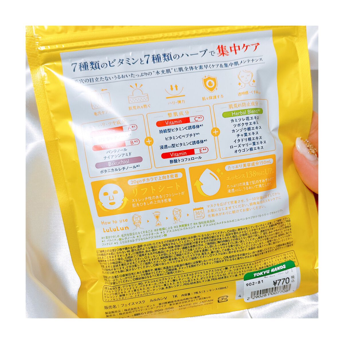 - ルルルンからビタミンたっぷりの化粧水フェイスマスクが新登場。 7種類のビタミン※1と7種類のハーブ※1で肌全体を素早くケア&集中肌メンテナンス。 新開発のフェイスラインに密着するシートで肌を引き締めながら肌のすみずみ※2までうるおいで満たし、毛穴の目立たないうるおいたっぷりの“水光肌”へ。 (※1 全て保湿成分として ※2 角質層まで)