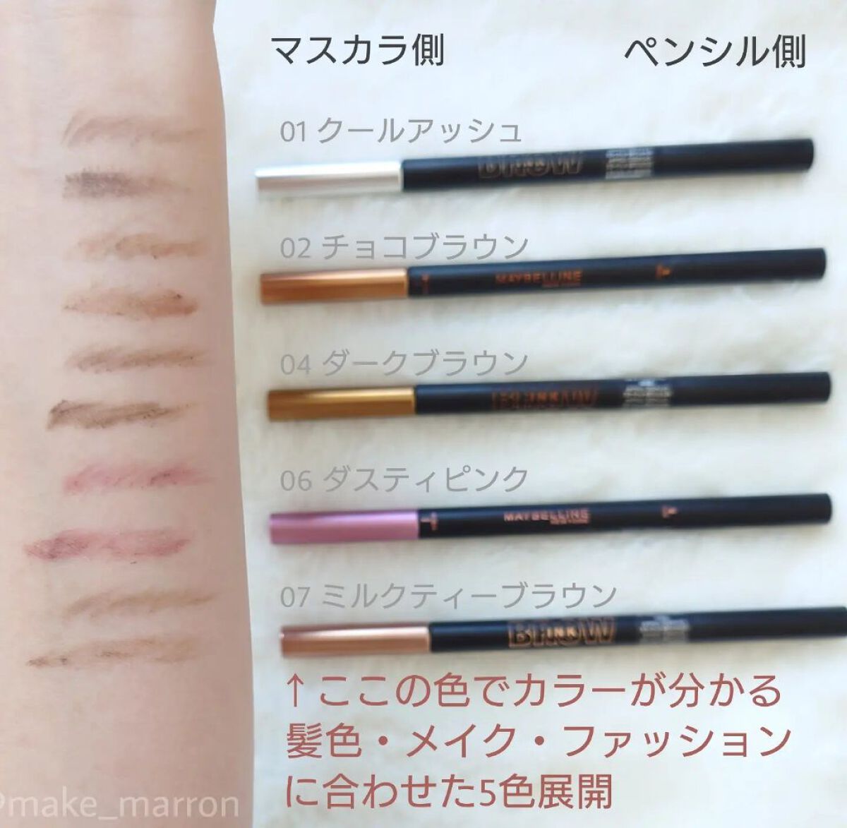 - 史上初*1 眉ペンシルと眉マスカラが1本に! STEP1:極細三角芯ペンシル 極細三角芯だから描きやすい! まばら眉も眉尻も自然に書き足せて、まるで自眉からキレイな仕上りへ*2 STEP 2: 高発色ジェルマスカラ ジェルティントフィルムが眉毛1本1本をコーティング。ブラシが小さく塗りやすいから、思い通りの毛流れにふんわりスタイリング。 さらに、水、こすれ、皮脂崩れにも夜までキレイ!*3 髪色、メイク、ファッションに合わせた6色展開 定番のアッシュブラウンからトレンドのくすみピンクまで。 *1 メイベリン ニューヨークにおいて。 *2 メイクアップ効果による印象。 *3 メイベリン ニューヨーク調べ。個人差があります。