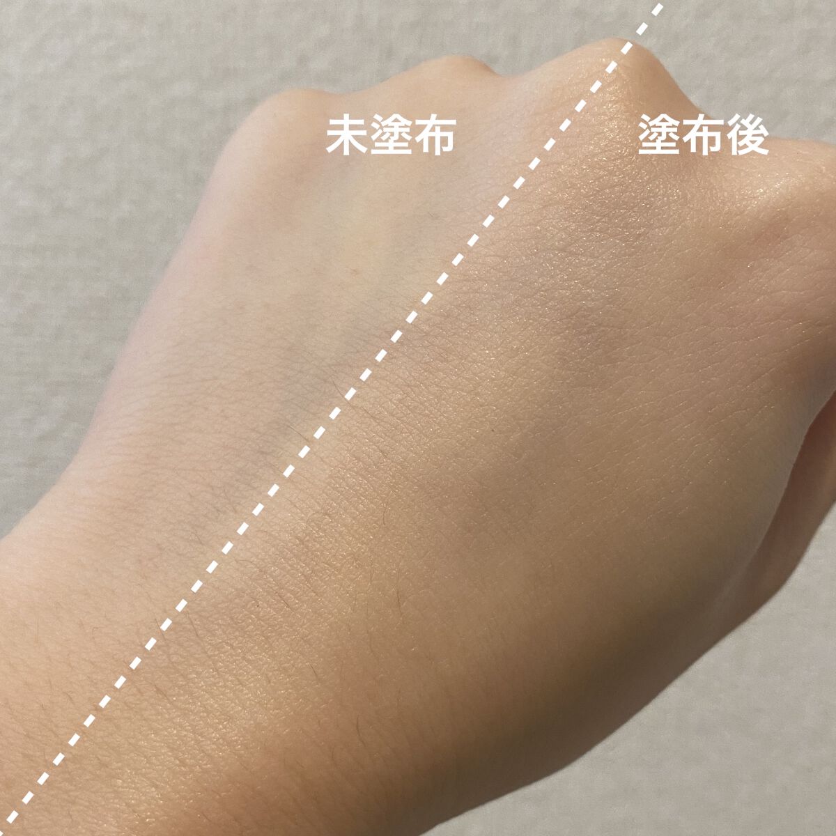 トーンアップするか否かの確認が漏れていて、無色透明のつもりで購入。開封時にパッケージを見てトーンアップやん!?!?となりました。しかしトーンアップと言っても艶で明るく見える程度の仕上がりで好みでした。 無色透明の方がベースメイク前に仕込むのに使いやすく、そのまま首やボディも塗れちゃうので手軽なんですよね。 塗りたては少しべたつくものの、時間が経つとベタつきは感じずしっとりとした触り心地に。
