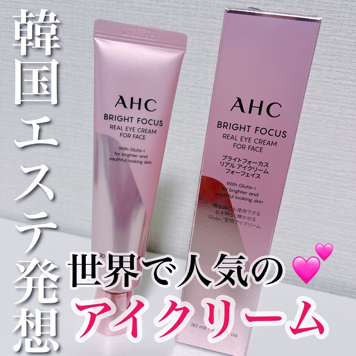 - 韓国でシリーズ累計1億本*1突破&AHC史上ロングランヒット*2! ■AHC独自の処方で、透明感のある、生き生きとした肌へ 複合スキンケア成分Gluta-i*3配合で、肌にうるおいを与え明るい印象へ導きます。 ■独自の高浸透技術「マイクロカプセルテクノロジー」を採用 エステティックスキンケアノウハウをもとに開発されたAHCブランド独自のマイクロカプセルテクノロジーを採用することで、 Gluta-i*3配合処方が効率よく角質層まで浸透。特別な技術を使わずとも、まるでエステで体験したようなリッチな透明感をご自宅でも体感いただくことができます。 ■瞬間ツヤ効果 濃厚でありながら、さらっとした心地の良いテクスチャーでべたつきにくい仕上がりです。うるおいを与えるクリーミー処方が、肌をなめらかにし、なじませた直後からツヤのある肌へ導きます。 ■目元だけでなく顔全体にも使えるアイクリーム デリケートな目元パーツへの使用はもちろんのこと、顔全体にもご使用いただけます。普段のスキンケアの 最後にスペシャルアイテムとしてお使いいただくことで、顔全体にしっかりとうるおいを与え、生き生きとした輝く肌へと仕上げます。 *1 シリーズ累計:2012年1月1日~2021年7月31日 韓国のみ(日本除く)で発売 CARVERKOREA調べ *2 同社商品内において *3 グルタチオン、ビサボロール、3-0-エチルアスコルビン酸、ヒアロルン酸Na、酸化チタン:整肌成分(光沢&保湿)