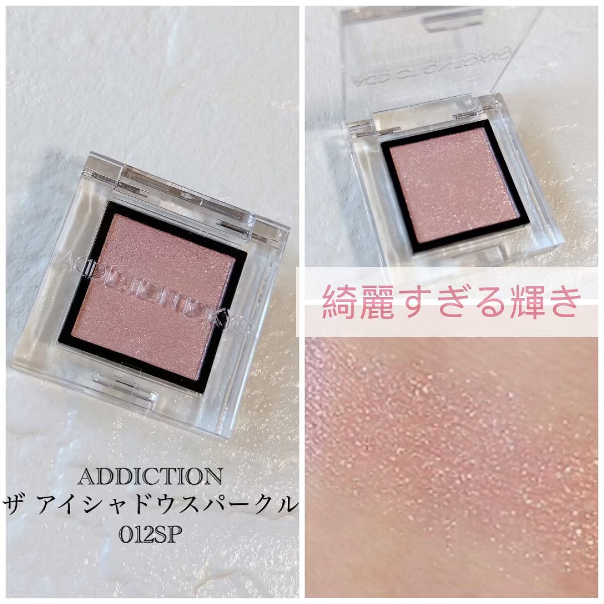 ほんのりピンクにシルバーとピンクの繊細なラメがたっぷりでとってもかわいいです!!! 実際に見ても可愛いし、写真の時でも可愛く映るのでお気に入りです🐻❄️ ADDICTION ザアイシャドウ スパークル 012SP Tiny Ballerina 2,200円(税込)
