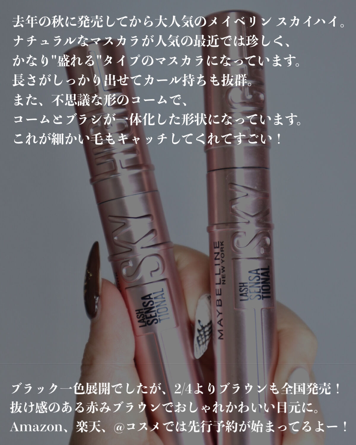 ■□今日はどのカラーにする??✨□■大人気の【メイベリンスカイハイ】から4月19日に新カラー登場♡今回の色は、夕暮れ時の空を思わせるようなやわらかくて、どこかアンニュイなモーブブラウン🪞ナチュラルなのに、ちゃんと印象に残る。まつげにニュアンス...