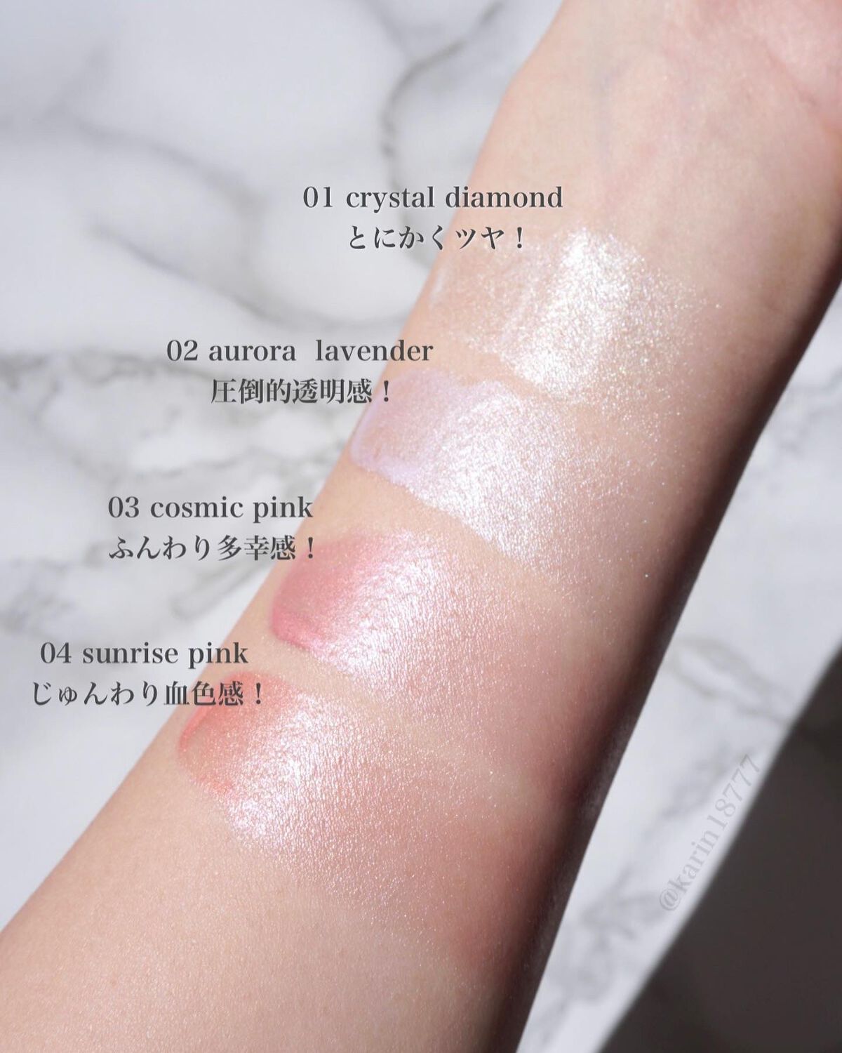 - <01 crystal diamond> 水、BG、DPG、メトキシケイヒ酸エチルヘキシル、トリエチルヘキサノイン、タルク、ジメチコン、ジエチルアミノヒドロキシベンゾイル安息香酸ヘキシル、ステアリン酸、アスコフィルムノドスムエキス、アスコルビン酸、アボカドエキス、カカオ脂、キウイエキス、ゴレンシ葉エキス、ヒバマタエキス、ブドウ葉エキス、ミルシアリアデュビア果実エキス、ラミナリアクロウストニエキス、レモン果実エキス、BHT、PEG-32、PEG-6、TEA、アクリレーツコポリマー、カルボマー、シリカ、ステアリン酸グリセリル、ステアリン酸グリセリル(SE)、セスキオレイン酸ソルビタン、セテアリルアルコール、ダイヤモンド末、テトラ(ジ-t-ブチルヒドロキシヒドロケイヒ酸)ペンタエリスリチル、トリセテアレス-4リン酸、ハイドロゲンジメチコン、ポリステアリン酸スクロース、ポリソルベート80、ポリプロピレン、ヤシ油、ラウリル硫酸Na、レシチン、フェノキシエタノール、香料、マイカ、酸化チタン <02 aurora lavender> 水、BG、DPG、メトキシケイヒ酸エチルヘキシル、トリエチルヘキサノイン、ジメチコン、ジエチルアミノヒドロキシベンゾイル安息香酸ヘキシル、ステアリン酸、PEG-32、PEG-6、シリカ、アスコフィルムノドスムエキス、アスコルビン酸、アボカドエキス、カカオ脂、キウイエキス、ゴレンシ葉エキス、ヒバマタエキス、ブドウ葉エキス、ミルシアリアデュビア果実エキス、ラミナリアクロウストニエキス、レモン果実エキス、BHT、TEA、アクリレーツコポリマー、カルボマー、ステアリン酸グリセリル、ステアリン酸グリセリル(SE)、セスキオレイン酸ソルビタン、セテアリルアルコール、タルク、ダイヤモンド末、テトラ(ジ-t-ブチルヒドロキシヒドロケイヒ酸)ペンタエリスリチル、トリセテアレス-4リン酸、ポリステアリン酸スクロース、ポリソルベート80、ポリプロピレン、メチコン、ヤシ油、ラウリル硫酸Na、レシチン、フェノキシエタノール、香料、グンジョウ、マイカ、酸化チタン、酸化鉄、赤226 <03 cosmic pink> 水、BG、DPG、メトキシケイヒ酸エチルヘキシル、トリエチルヘキサノイン、ジメチコン、ジエチルアミノヒドロキシベンゾイル安息香酸ヘキシル、ステアリン酸、PEG-32、PEG-6、シリカ、アスコフィルムノドスムエキス、アスコルビン酸、アボカドエキス、カカオ脂、キウイエキス、ゴレンシ葉エキス、ヒバマタエキス、ブドウ葉エキス、ミルシアリアデュビア果実エキス、ラミナリアクロウストニエキス、レモン果実エキス、BHT、TEA、アクリレーツコポリマー、カルボマー、ステアリン酸グリセリル、ステアリン酸グリセリル(SE)、セスキオレイン酸ソルビタン、セテアリルアルコール、タルク、ダイヤモンド末、テトラ(ジ-t-ブチルヒドロキシヒドロケイヒ酸)ペンタエリスリチル、トリセテアレス-4リン酸、ポリステアリン酸スクロース、ポリソルベート80、ポリプロピレン、メチコン、ヤシ油、ラウリル硫酸Na、レシチン、フェノキシエタノール、香料、グンジョウ、マイカ、酸化チタン、酸化鉄、赤226