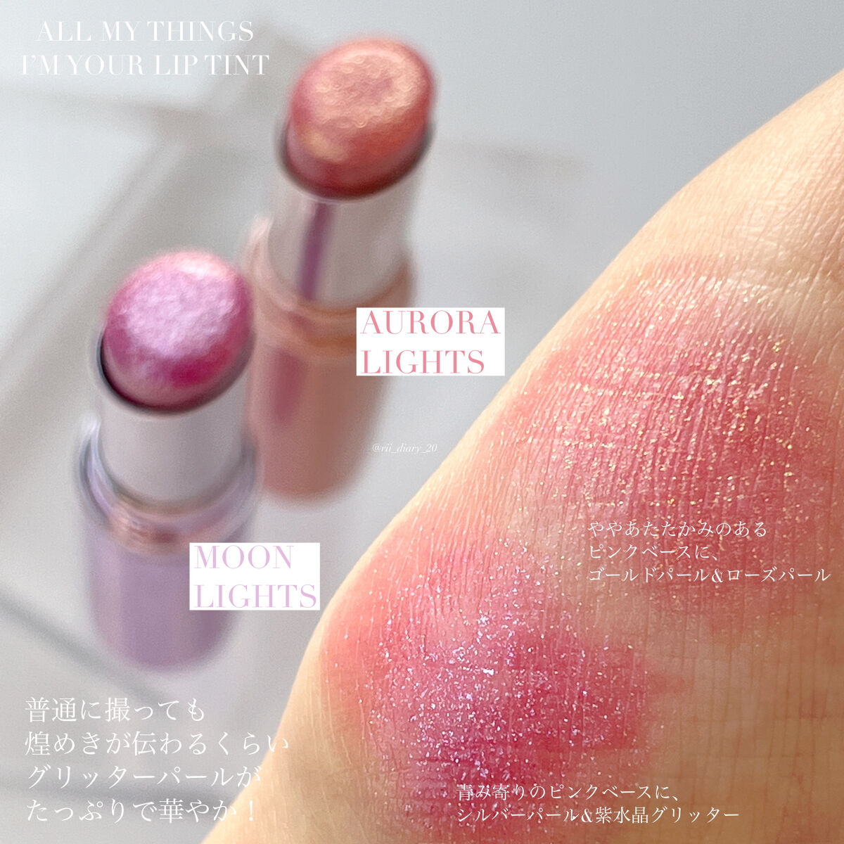 。.ꕤ‿allmythingsアイムユアリップティント‿ꕤ.。05オーロラライツピンクローズラメ✕ゴールドラメがかわいいリップティントです!公式写真で見たよりも青みピンクでしたが、発色は控えめなのでPC問わず使いやすそうです。重ね塗りするとし...