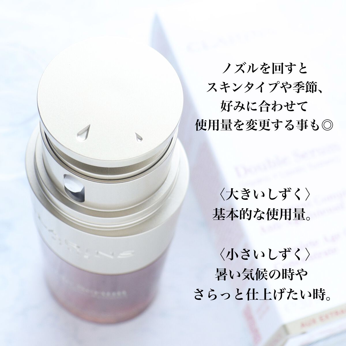 - コスメ賞を多数受賞するクラランスNo.1美容液。 20種類以上の植物由来成分が配合された、オイルxウォーターのダブルフェイズのエイジングケア美容液。すべての肌タイプに対応し、パワフルにケアします。 すばやく肌*に浸透し、肌を引き締め、ハリ・弾力感のある活き活きとした肌へ。 オイルセラム(油溶性)と、ウォーターセラム(水溶性)を容器内部で分けているため、使うたびにフレッシュなまま肌に届きます。 *角質層