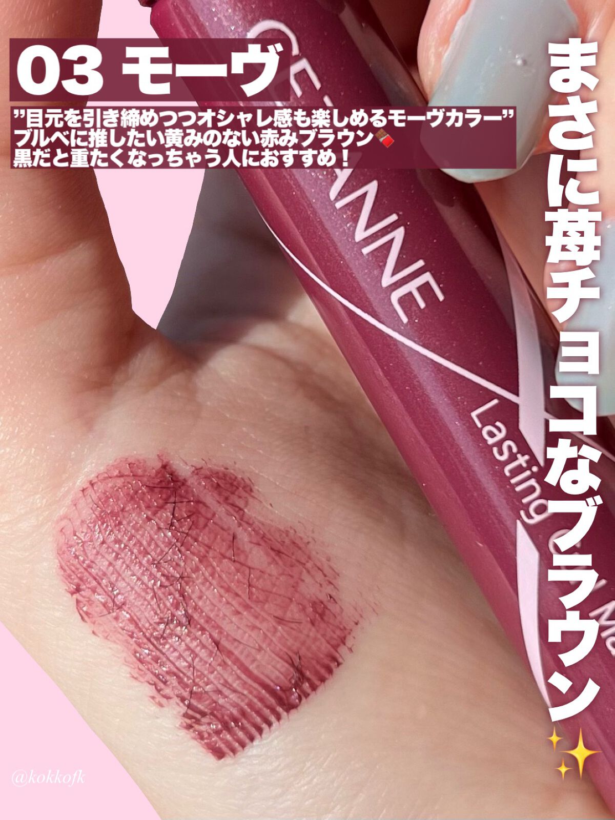 - <00 クリア> イソドデカン、トリメチルシロキシケイ酸、(パルミチン酸/エチルヘキサン酸)デキストリン、ジステアルジモニウムヘクトライト、パルミチン酸デキストリン、ポリブテン、トリイソステアリン酸ポリグリセリル-2、炭酸プロピレン、フェノキシエタノール、トコフェロール、パンテニルエチル、ホホバ種子油、ラウロイルグルタミン酸ジ(フィトステリル/オクチルドデシル) <01 ブラック> イソドデカン、トリメチルシロキシケイ酸、カルナウバロウ、パルミチン酸デキストリン、クオタニウムー90ベントナイト、ポリブテン、(パルミチン酸/エチルヘキサン酸)デキストリン、(アクリレーツ/ジメチコン)コポリマー、トリイソステアリン酸ポリグリセリルー2、炭酸プロピレン、ナイロンー6、フェノキシエタノール、トコフェロール、シリカ、カーボンブラック、パンテニルエチル、ホホバ種子油、ラウロイルグルタミン酸ジ(フィトステリル/オクチルドデシル)、酸化鉄 <02 ブラウン> イソドデカン、トリメチルシロキシケイ酸、カルナウバロウ、パルミチン酸デキストリン、クオタニウムー90ベントナイト、ポリブテン、(パルミチン酸/エチルヘキサン酸)デキストリン、(アクリレーツ/ジメチコン)コポリマー、トリイソステアリン酸ポリグリセリルー2、炭酸プロピレン、ナイロンー6、フェノキシエタノール、トコフェロール、シリカ、カーボンブラック、パンテニルエチル、ホホバ種子油、ラウロイルグルタミン酸ジ(フィトステリル/オクチルドデシル)、酸化鉄、グンジョウ、酸化チタン、水酸化Al <03 モーヴ> イソドデカン、トリメチルシロキシケイ酸、カルナウバロウ、パルミチン酸デキストリン、クオタニウムー90ベントナイト、ポリブテン、(パルミチン酸/エチルヘキサン酸)デキストリン、(アクリレーツ/ジメチコン)コポリマー、トリイソステアリン酸ポリグリセリルー2、炭酸プロピレン、ナイロンー6、フェノキシエタノール、トコフェロール、シリカ、カーボンブラック、パンテニルエチル、ホホバ種子油、ラウロイルグルタミン酸ジ(フィトステリル/オクチルドデシル)、酸化鉄、グンジョウ、赤226、酸化チタン、水酸化Al <04 グレージュ> イソドデカン、トリメチルシロキシケイ酸、カルナウバロウ、パルミチン酸デキストリン、クオタニウムー90ベントナイト、ポリブテン、(パルミチン酸/エチルヘキサン酸)デキストリン、(アクリレーツ/ジメチコン)コポリマー、トリイソステアリン酸ポリグリセリルー2、炭酸プロピレン、ナイロンー6、フェノキシエタノール、トコフェロール、シリカ、カーボンブラック、パンテニルエチル、ホホバ種子油、ラウロイルグルタミン酸ジ(フィトステリル/オクチルドデシル)、酸化鉄、酸化チタン、グンジョウ、水酸化Al
