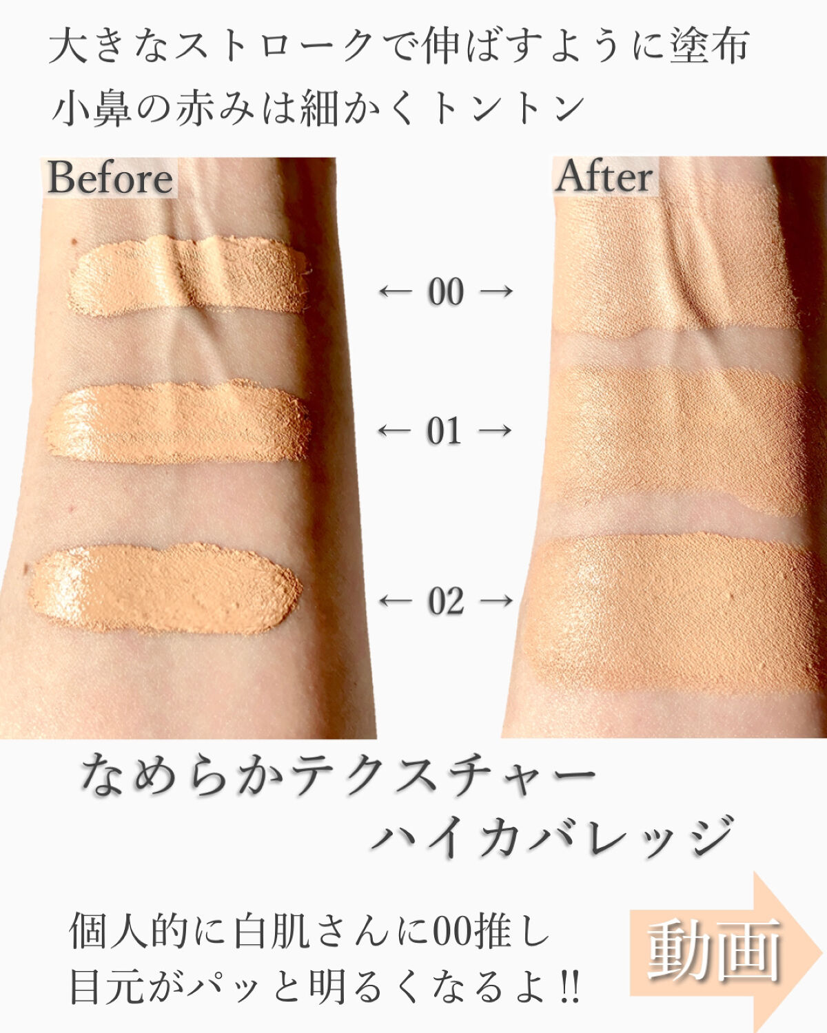 - <01 ライトオークル> 水、シクロペンタシロキサン、セチルPEG/PPG-10/1ジメチコン、グリセリン、BG、トリメチルシロキシケイ酸、ペンチレングリコール、リンゴ酸ジイソステアリル、ジイソステアリン酸ポリグリセリル-2、ジエチルヘキサン酸ネオペンチルグリコール、ジグリセリン、ベタイン、ポリメチルシルセスキオキサン、硫酸Mg、マイカ、ジメチコン、ソルビトール、フェノキシエタノール、ジフェニルシロキシフェニトリメチコン、(ジメチコン/ビニルジメチコン)クロスポリマー、トコフェロール、ヒアルロン酸Na、オリーブ果実油、ホホバ種子油、メドウフォーム油、パルミチン酸レチノール、コーン油、クダモノトケイソウ果実エキス、アロエベラ葉エキス、(+/−)酸化チタン、タルク、酸化鉄、水酸化Al、トリエトキシカプリリルシラン、ステアリン酸 <02 オークル> 水、シクロペンタシロキサン、セチルPEG/PPG-10/1ジメチコン、グリセリン、BG、トリメチルシロキシケイ酸、ペンチレングリコール、リンゴ酸ジイソステアリル、ジイソステアリン酸ポリグリセリル-2、ジエチルヘキサン酸ネオペンチルグリコール、ジグリセリン、ベタイン、ポリメチルシルセスキオキサン、硫酸Mg、マイカ、ジメチコン、ソルビトール、フェノキシエタノール、ジフェニルシロキシフェニルトリメチコン、(ジメチコン/ビニルジメチコン)クロスポリマー、トコフェロール、ヒアルロン酸Na、オリーブ果実油、ホホバ種子油、メドウフォーム油、パルミチン酸レチノール、コーン油、クダモノトケイソウ果実エキス、アロエベラ葉エキス、(+/−)酸化チタン、タルク、酸化鉄、水酸化Al、トリエトキシカプリリルシラン、ステアリン酸