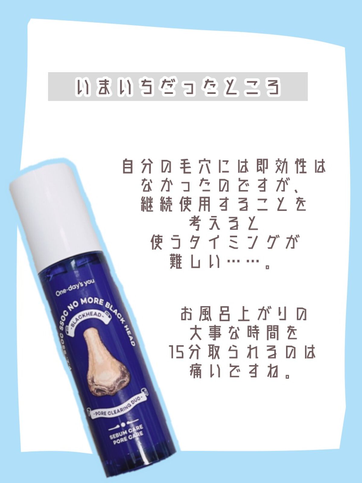 個人的には低刺激で毛穴ケアができることはとっても嬉しかった!🫰🌟 ̖́- 合わなかった人もいるみたいなので敏感肌さんはもしかしたら刺激を感じてしまうかもしれませんが……。 七野がリピなしにした理由はズバリ、継続使用がめんどくさいからです。 この3つが揃うと何が起こるかというと…… ① 入浴後の使用:ドライヤーがかけられない ② 入浴中の使用:入浴時間が15分以上確保できない ③ スキンケアのステップがずれる