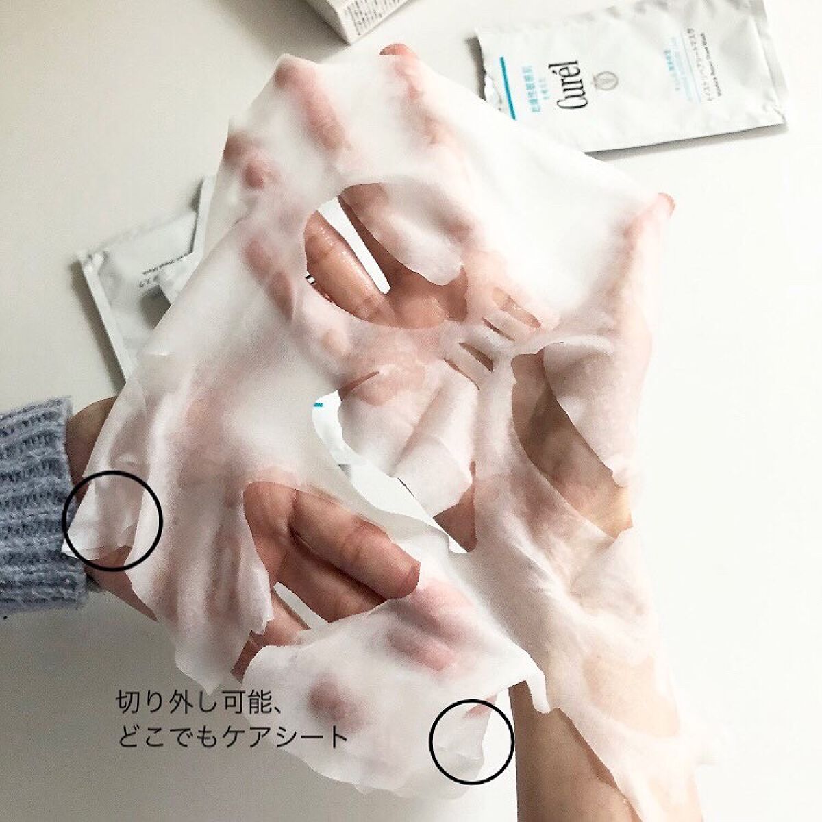 肌荒れを防ぐ消炎剤配合(有効成分) ✔️ セラミドの働きを補い、濃密な潤いをすみずみまで補給してくれるそう ✔️肌あたりやわらかなシートマスク 厚めのシートで肌あたりも良く、肌にピタッと密着してくれます。お肌が敏感な時でも優しい使い心地と、キメが整いもちっとする使用感がいいです。 マスクの下の部分は、切り離して小鼻等の隙間に貼れます。マスクのサイズによっては隙間ができるものもあるので、これも嬉しい。