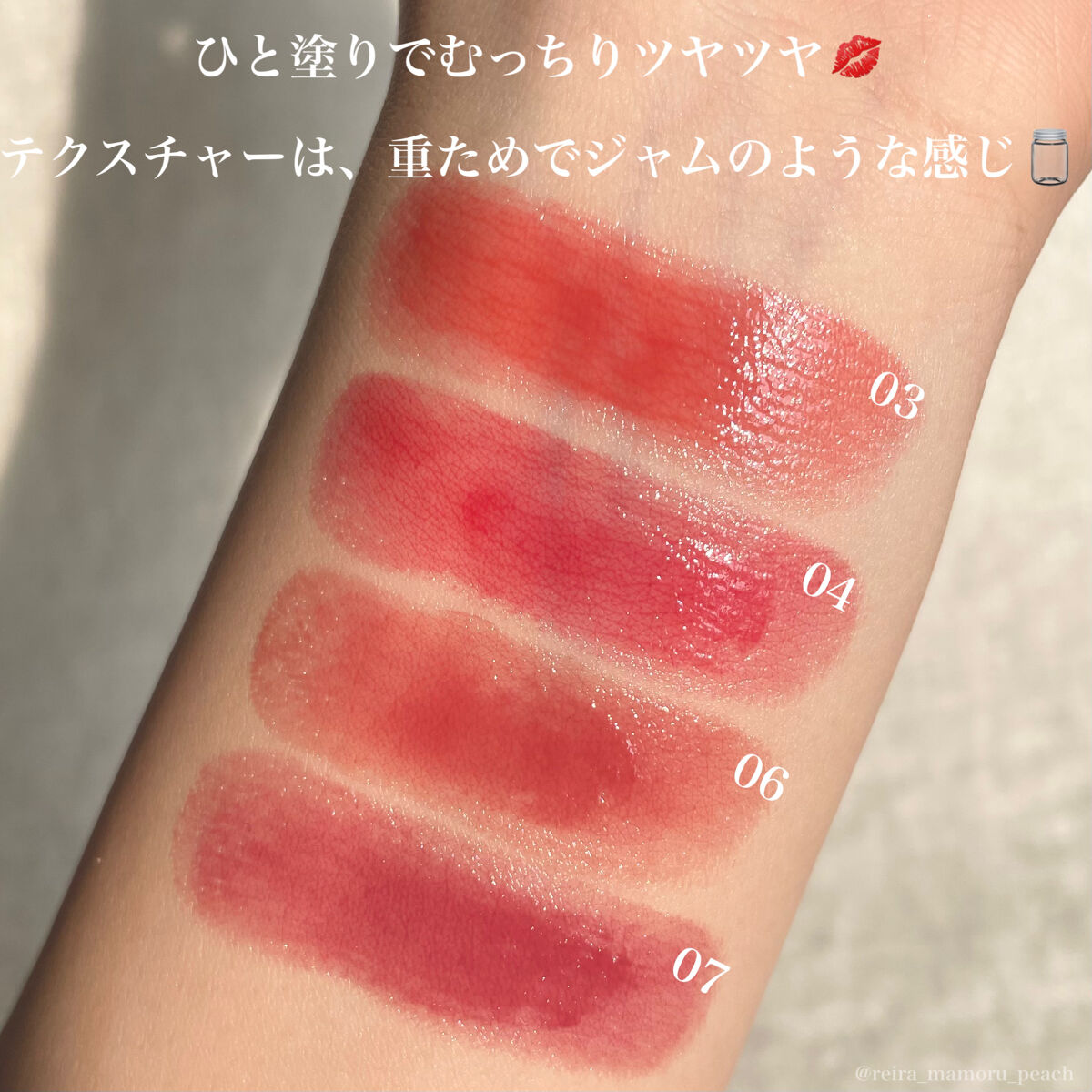 - もちっとした水膜で弾けそうなツヤリップ 1.軽い塗り心地のなめらかで透明な水爆弾ツヤ 2.塗った瞬間から唇を鮮やかに彩る多彩なカラーバーム 3.植物性保湿オイルでしっとりもっちり保湿バーム