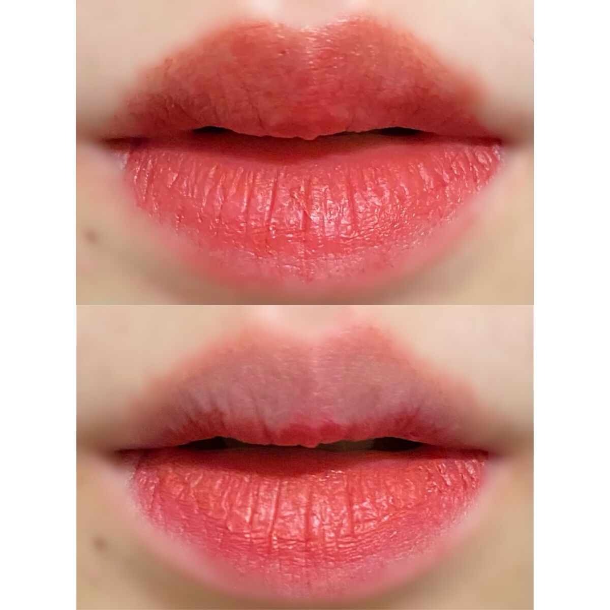 発色は一度塗りだと透け感がある感じで 重ねれば重ねるだけよく発色します。 ツヤ感のあるリップでスルスルと塗れます。 ツヤ仕上がりでティントでもないので 色持ちは喋ってるだけで一瞬で落ちるというわけではないですが 飲食をしたら普通に落ちますし マスクにもつきます。 個人的にこのリップで苦手なのはにおいです。 我慢できないほどではないのですが THE化粧品といいますか マダム感といいますか..